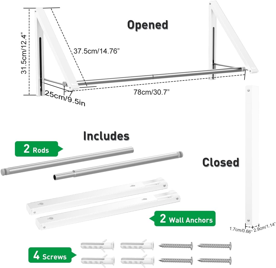- This clothes wall hanger is made of high quality aluminum, non-corroding, a good light weight but sturdy and durable small item. Open size: About 12.6 x 11.42 x 1.18 IN / 32 x 29 x 3 CM (W x D x H); Closed size: About 14.69 x 1.18 x 0.71 IN / 37.3 x 3 x 1.8 CM (W x D x H). Rod Length: 32.2IN
