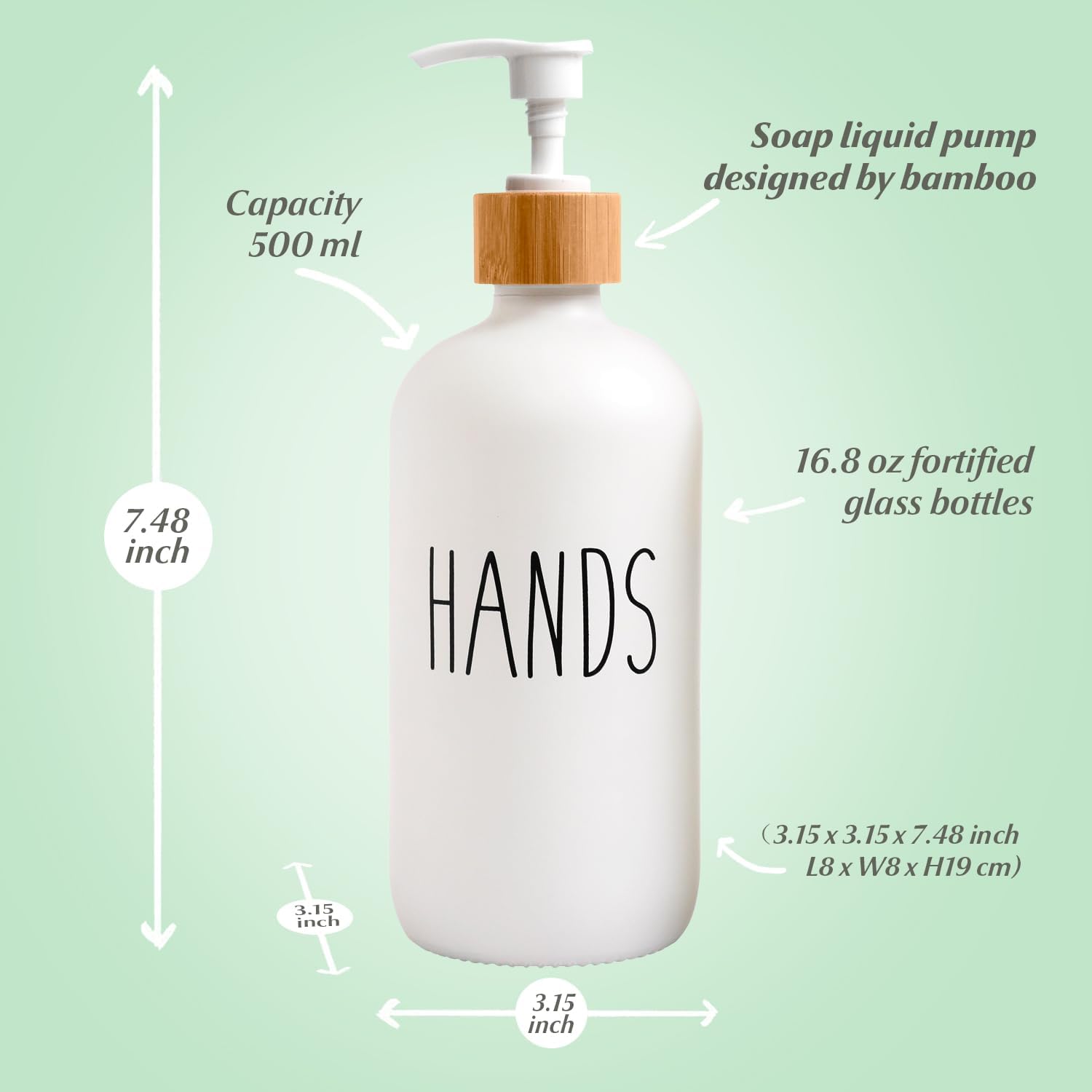 - HANDS & DISHES For Kitchen Use - Bottles contain Hands and Dishes marks on the bottle. If you are having problems mix up or get asked “Which Soap is Which?", this would solve this problem well. The label is not only good for distinction glass soap dispenser with pump but also looks elegant.