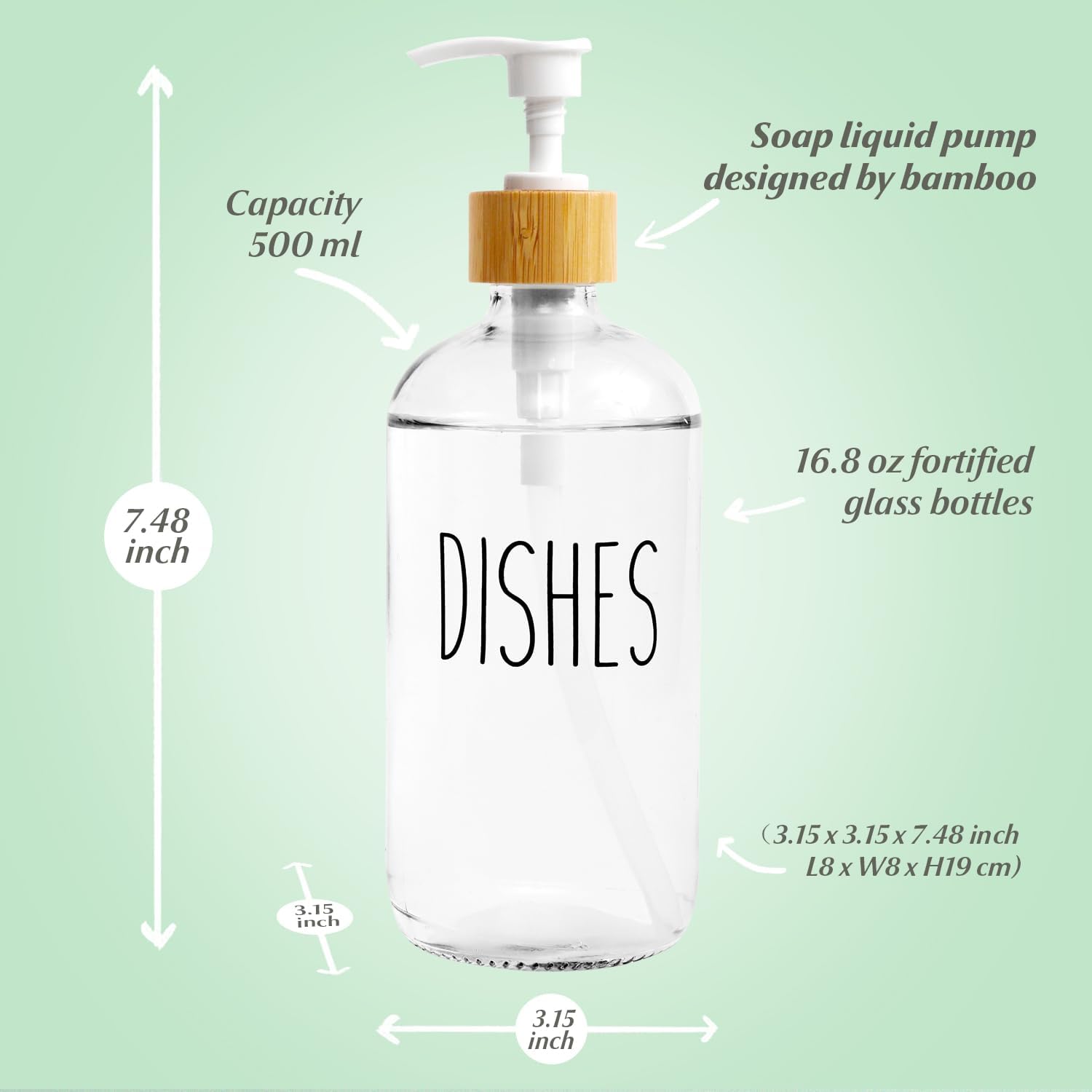 - HANDS & DISHES Clear Dispensers For Kitchen Use - Bottles contain Hands and Dishes marks on the bottle. If you are having problems mix up or get asked “Which Soap is Which?", this would solve this problem well. The label is not only good for distinction glass soap dispenser with pump but also looks elegant.
