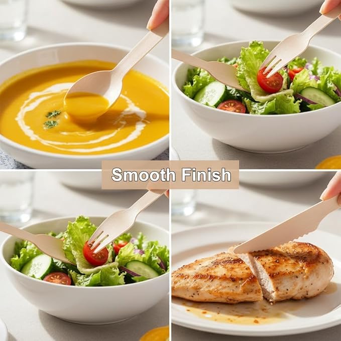 - COST EFFECTIVE SAFE PURCHASE: Our disposable wood cutlery serves as an essential gift for friends and family and anyone who loves high-quality disposable eco friendly utensils; We ensure that our wooden cutlery set also called bamboo cutlery will meet your expectations; If for any reason, it doesn’t, we offer returns without questions asked; If you have any issues with our wooden flatware set, contact us and we will ensure you have a positive experience while using our disposable biodegradable cutlery set.