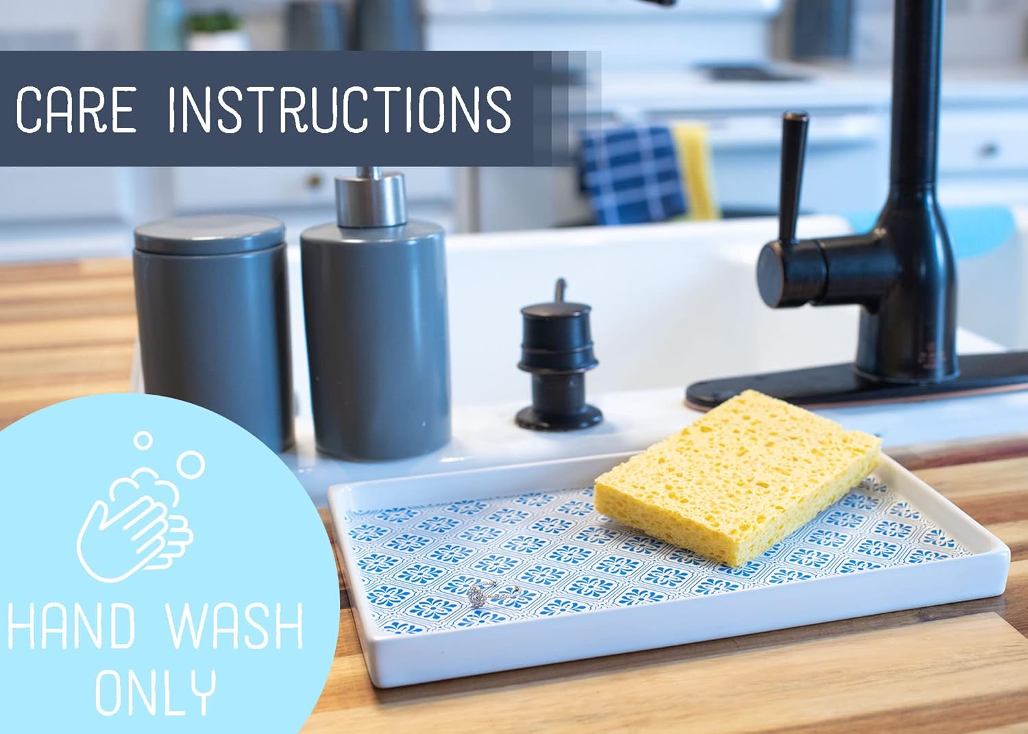 NAT & Jules 10 x 6 Ceramic Stoneware Vanity Tray - Perfect Bathroom or Kitchen Counter Organization Décor: Sponge Holder, Soap Dish, Jewelry and Perfume Tray, Patterned Blue