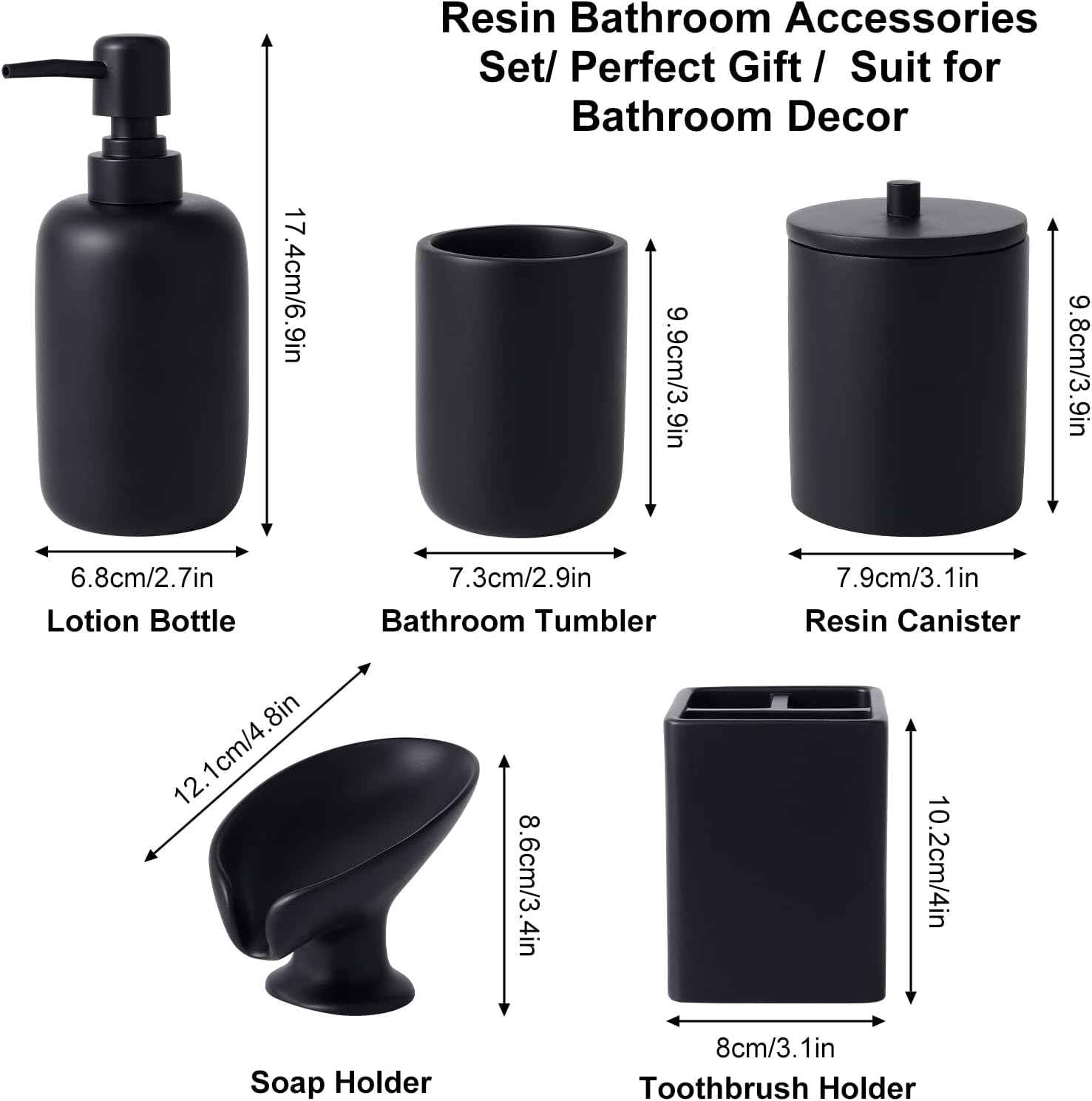 - RESIN BLACK BLACK BATHROOM ACCESSORIES SET COMPLETE - Our bathroom set includes 1x soap dispenser, 1x canister, 1x toothbrush cup, 1x self draining soap dish and 1x tumbler. A complete set of all-in-one bathroom essentials that are easily accessible!