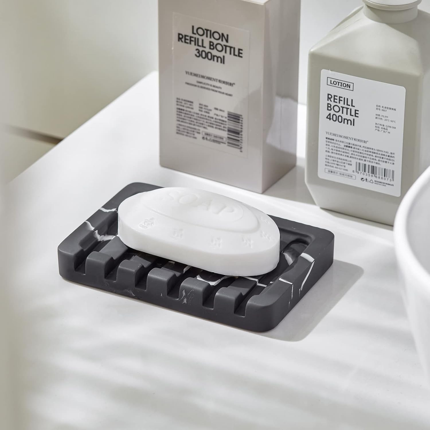 2PCS Self Draining Soap Dish - Marble Look Soap Holder Tray Savers Box Container Sponge Holder for Bathroom Shower Kitchen, Black