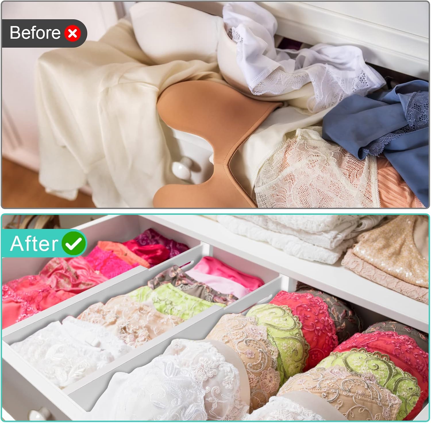 - Adjustable Drawer Dividers: Adjustable drawer dividers range from 11.8-17 inches in length; fits easily in most drawers to keep your belongings organized and easy to access