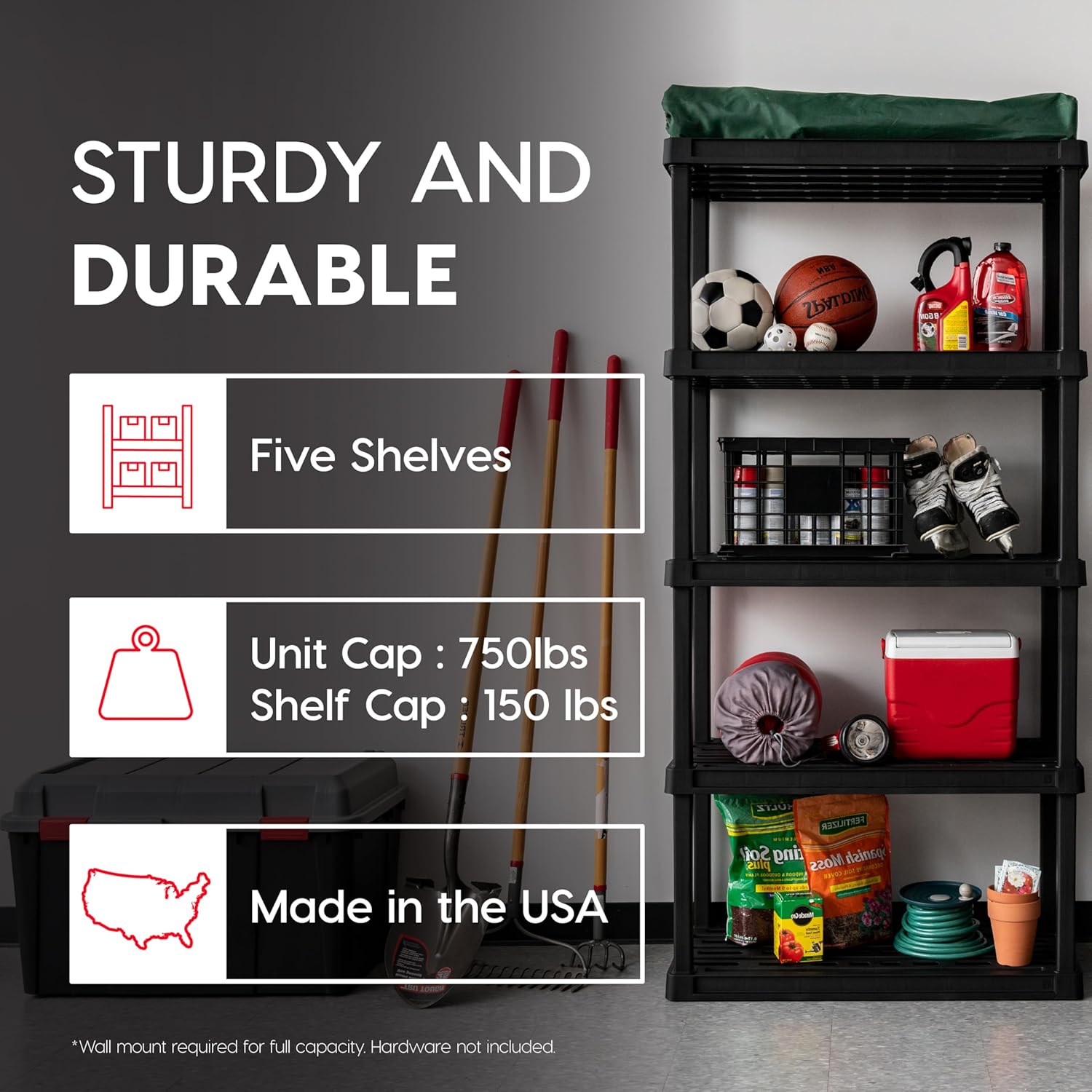 IRIS USA 5-Shelf Heavy Duty Plastic Storage Shelves, 750lb Capacity, 73"H x 36"W x 18"D, Large Modular Shelving Unit Storage Organizer for Garage, Home, Warehouse & Gym, Storage Rack - Black