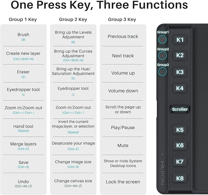 - Programmable Scroll & Shortcut Keys: Unique scroll wheel & 8 press keys can be customized to your favorite shortcut so that your creative work become smoother and more efficient. You also can change the setting for different apps.