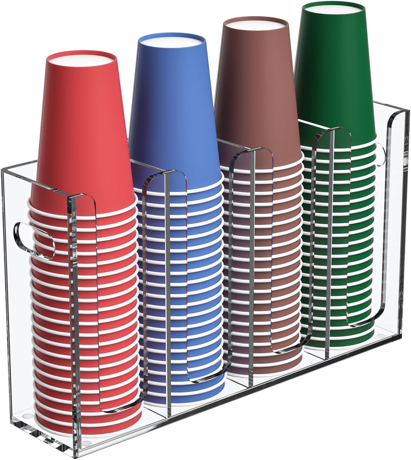 - Material - made of 4mm thickness acrylic, the disposable cup organizer is an ideal container to make your home kitchen bathroom or break room office coffee station area less cluttered, it keeps plastic or paper coffee cups or tops organized. No more cups and lids floating around when wind picks up.