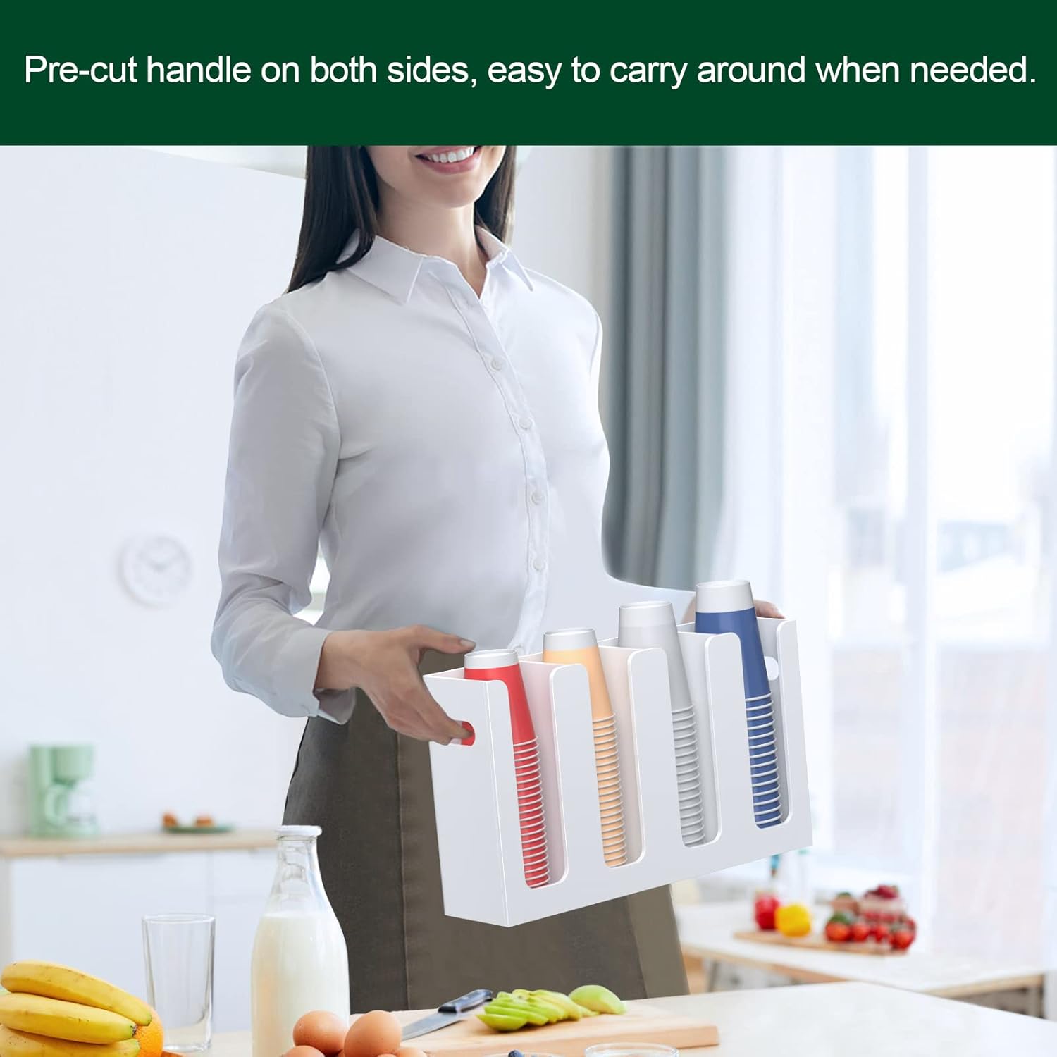 - Cup Dispenser with Handles on Both Sides - pre-drilled handles on side and holes on back, provides more possibilities, either mount it on wall of your kitchen or office, or let it stand along the side of your cabinet in the trailer, you make the decision.
