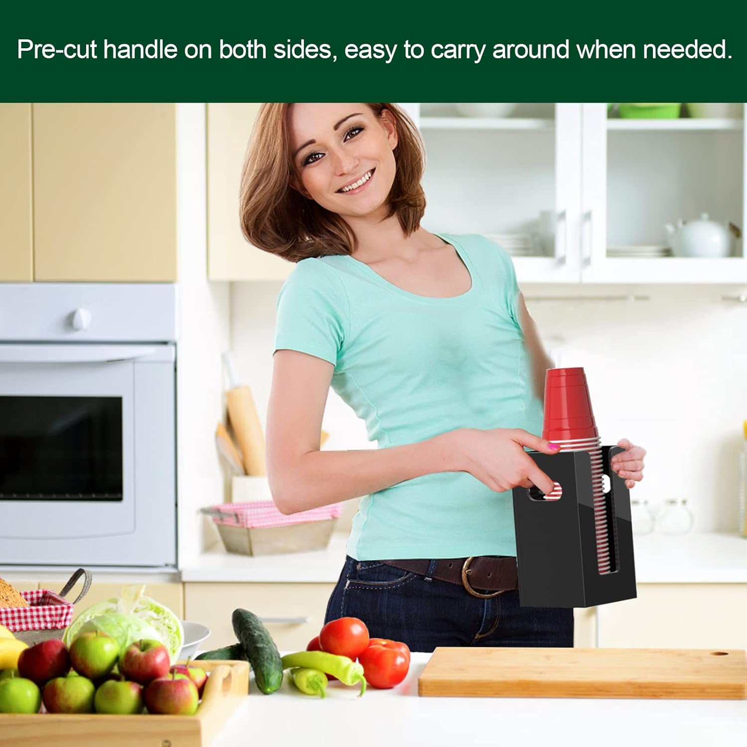 - Cup Dispenser with Handles on Both Sides - pre-drilled handles on side and holes on back, provides more possibilities, either mount it on wall of your kitchen or office, or let it stand along the side of your cabinet in the trailer, you make the decision.
