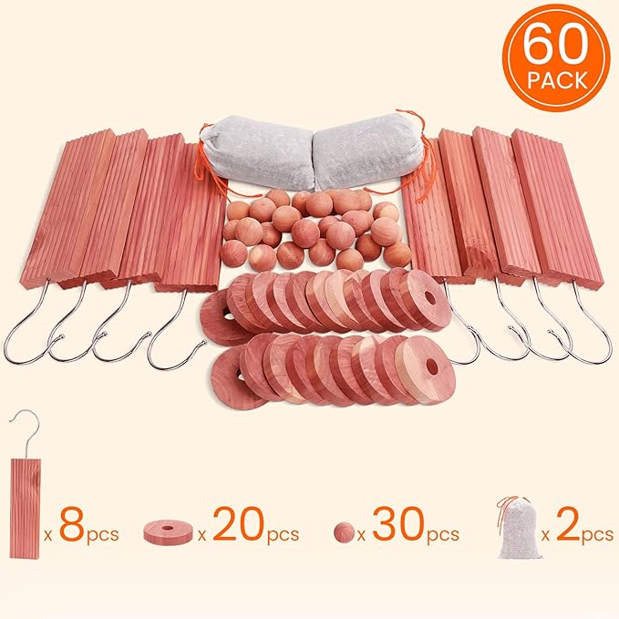 Homode Cedar Blocks for Clothes Storage, Set of 60, Cedar Chips & Sachets - Aromatic Cedar Wood Balls for Closets, Drawers, Fresh Essentials
