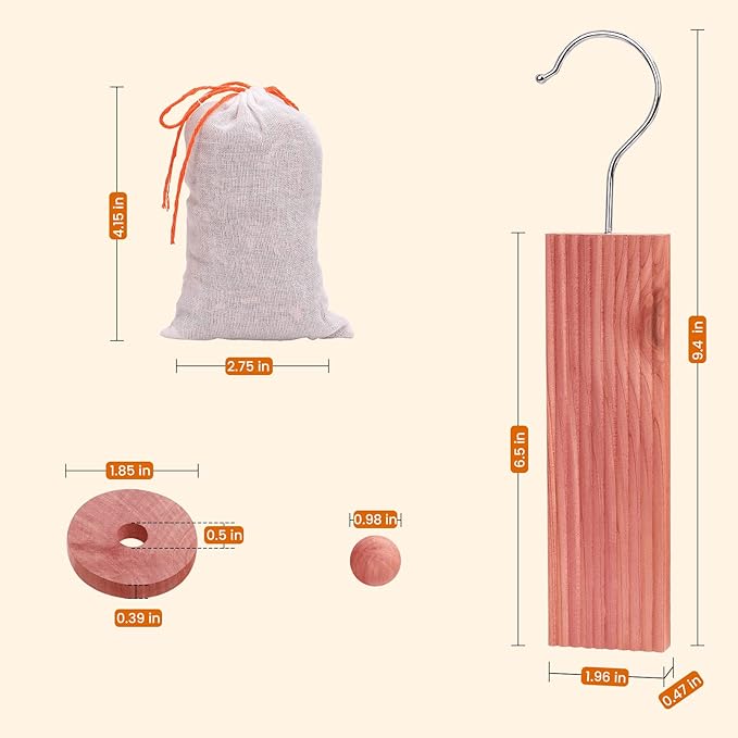 - EASY CLOTHES STORAGE: Cedar closet pack with 8 cedar hang ups, 20 cedar rings, 30 cedar balls, 2 cedar sachets and 1 sandpaper protects your linens and clothing in closets, wardrobe or storage bags naturally
