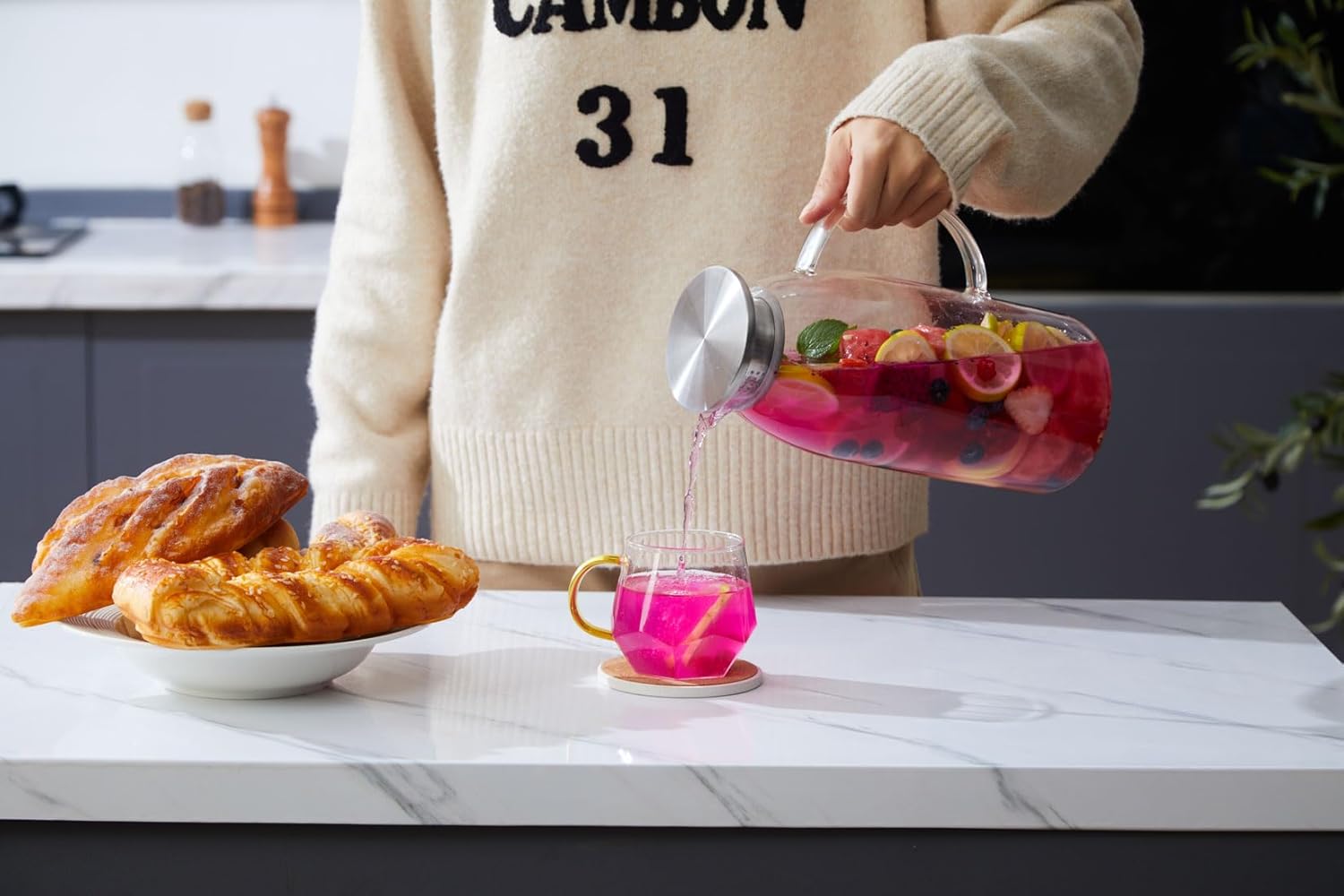 - [Premium Quality]: This glass pitcher is made of Heat-resistant Borosilicate Glass, lead-free, lightweight, durable, stove-top safe.