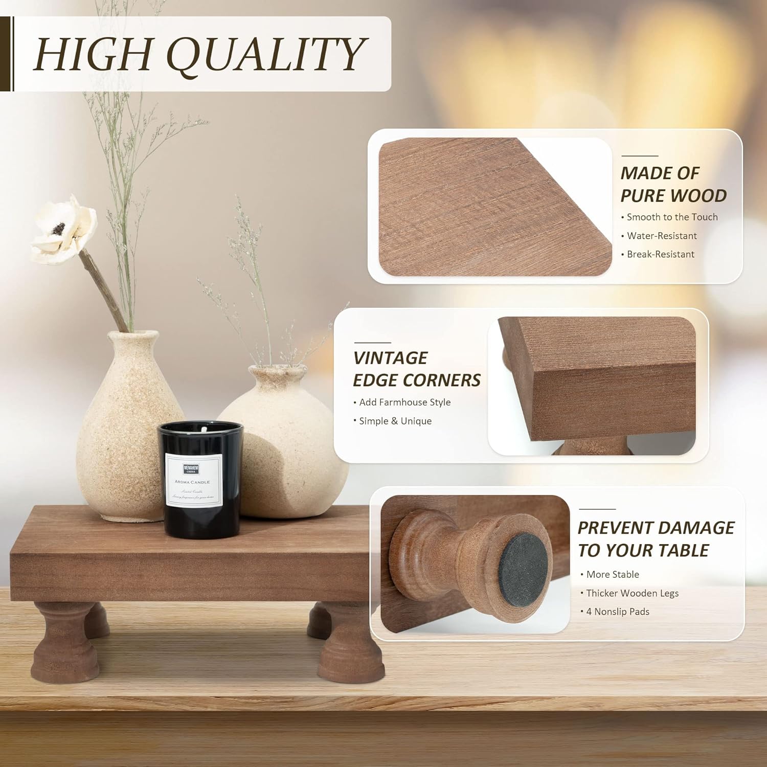 - [YOUR STYLISH PREMIUM PEDESTAL STAND ] This small wood riser is made of 100% pure wood, durable, and easy to set up. We equipped the tray legs with 4 non-slip pads, this riser suitable for long-term uses.