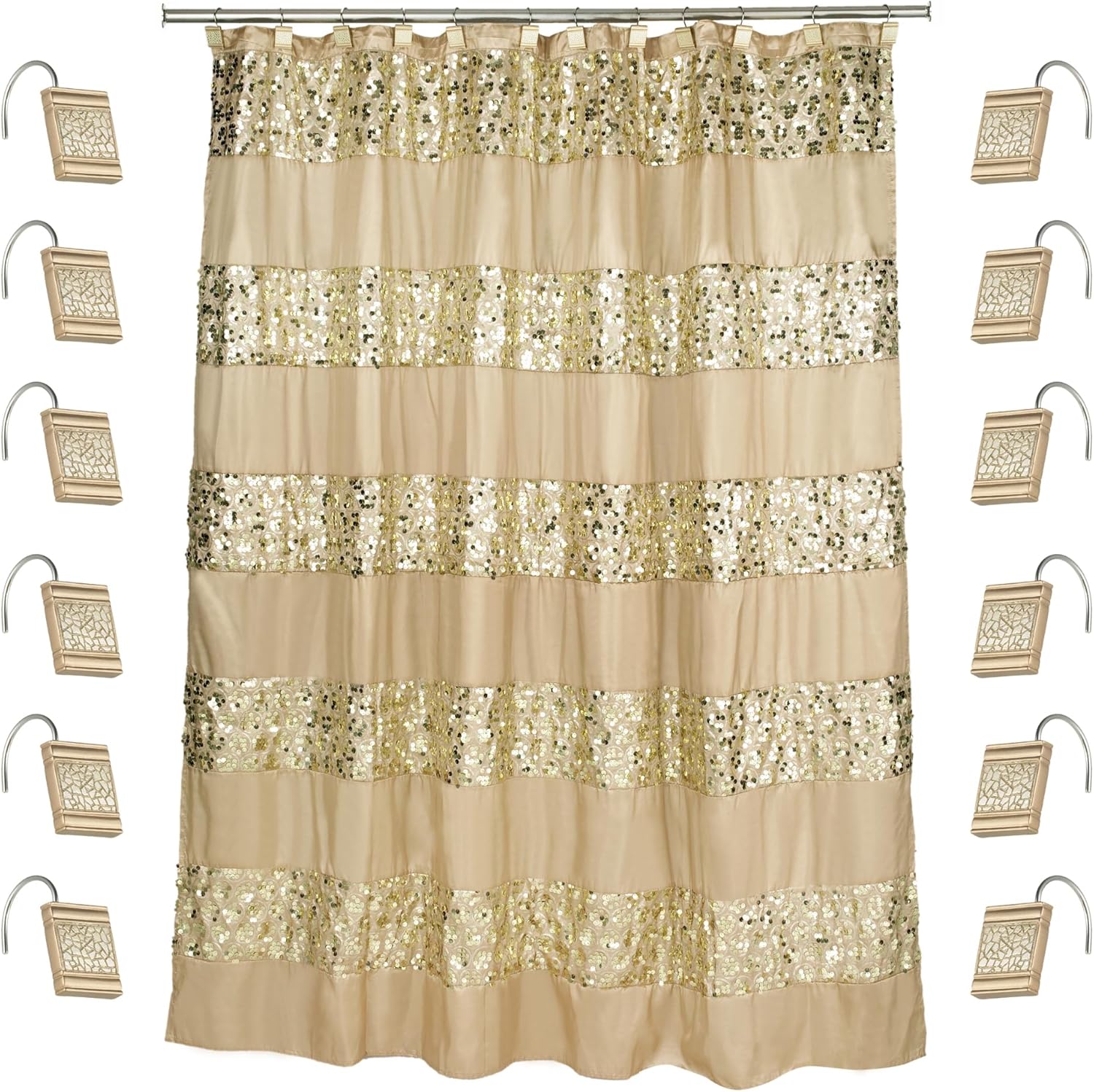 Zahari Home 13pc Sinatra Bathroom Shower Curtain Set - Gold Curtain & 12 Champagne Hooks - Luxury Fabric Bling Unique Beautiful Set