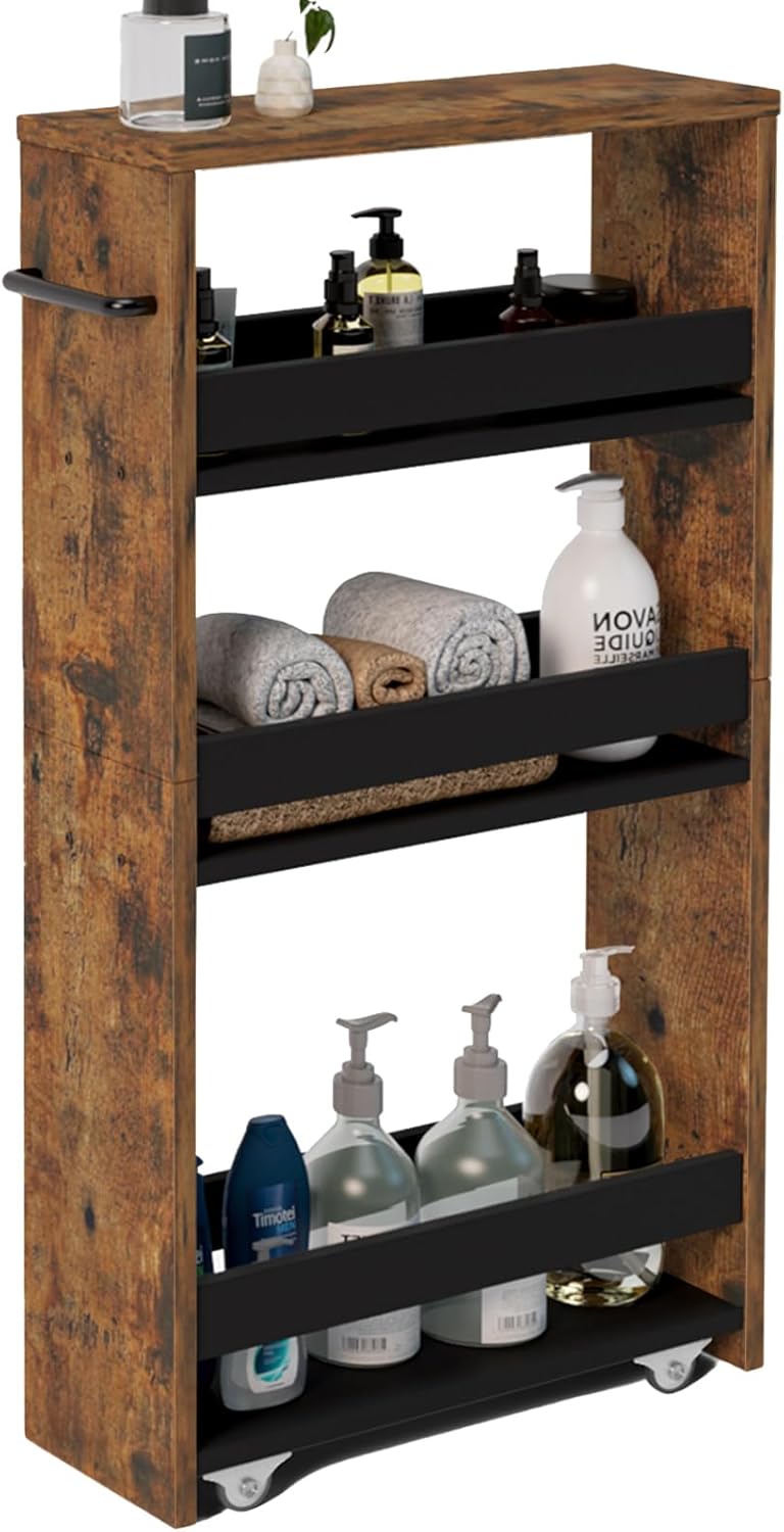 MARTY Slim Rolling Cart 4-Tier Utility Carts with Wheels Handle, Kitchen Storage Cart Slide Out Mobile Shelving Unit Organizer for Bathroom Laundry Room Organization Narrow Places (Rustic Brown)