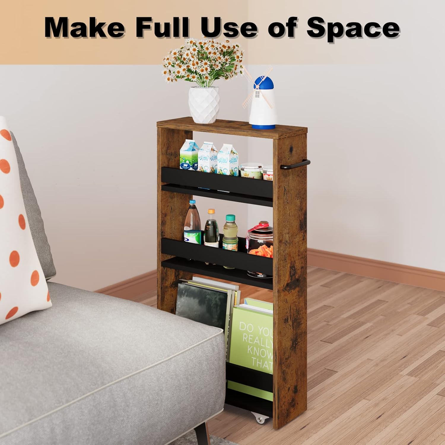 - 【Easy to Move】This slim storage rack has 1 handle and 4 wheels, which can be easily pulled out for use when needed and can also be easily pushed in for storage.