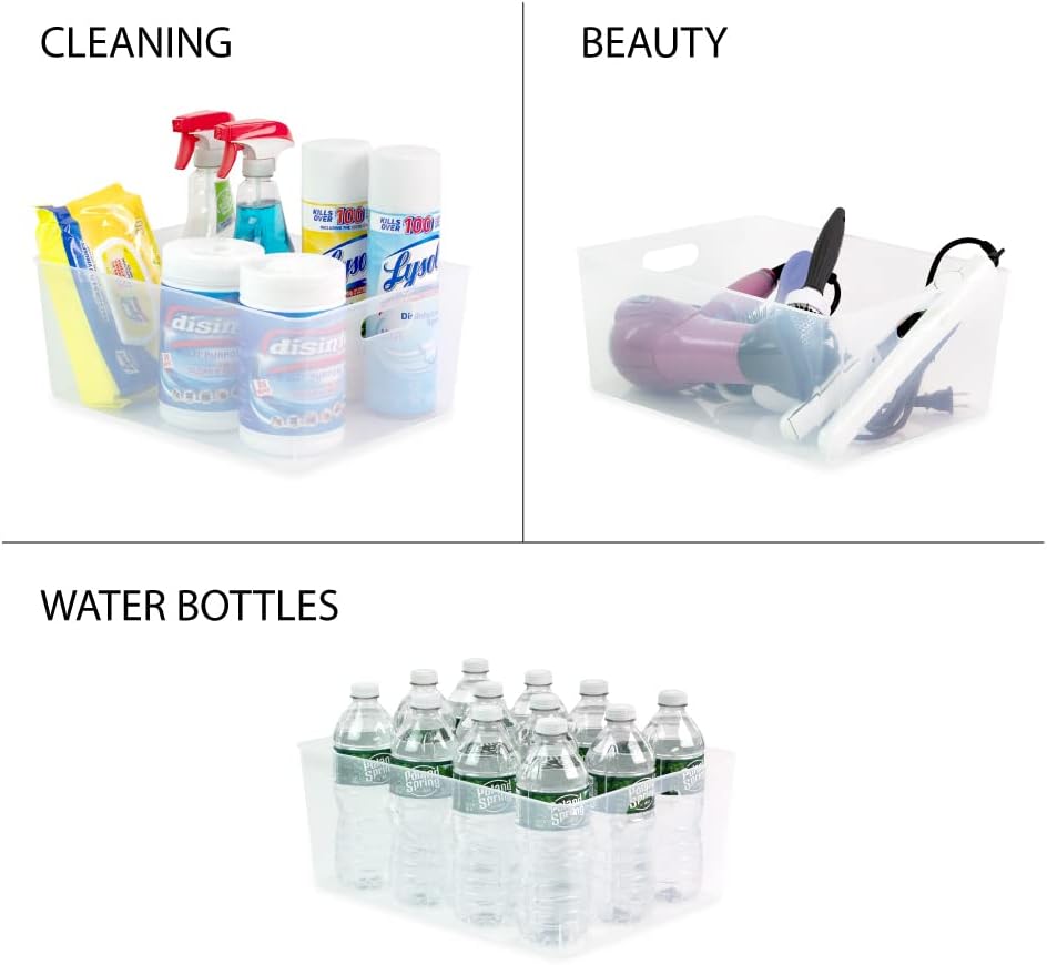 - MULTI-USE: These BPA free bins can be used all around the home for optimum storage. Great in the kitchen, these clear bins are large enough to store cereal boxes, chips, cookies and other snacks. Use them to keep items like paper towels, sandwich bags and aluminum foil organized. They’re also perfect for closets and bathrooms! Group cleaning supplies together in one bin to keep under sink storage tidy, or use them to hold toiletries like hair, bath, and body products.