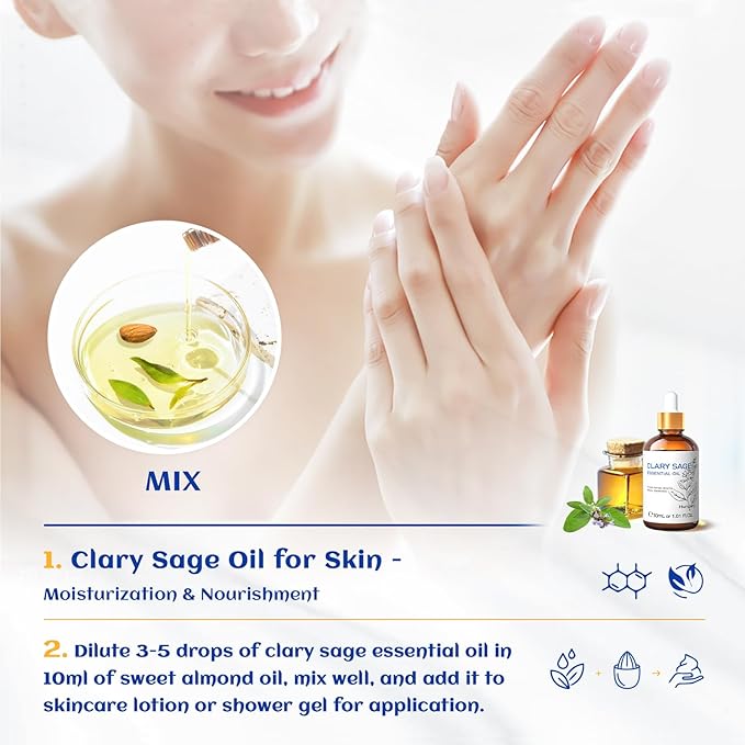 - Multi-Purpose: Clary sage oil essential oil has a multi-purpose natural remedy with a refreshing aroma that can help relax the mind, balance hormones, regulate mood swings, and balance oil production, improve enlarged pores