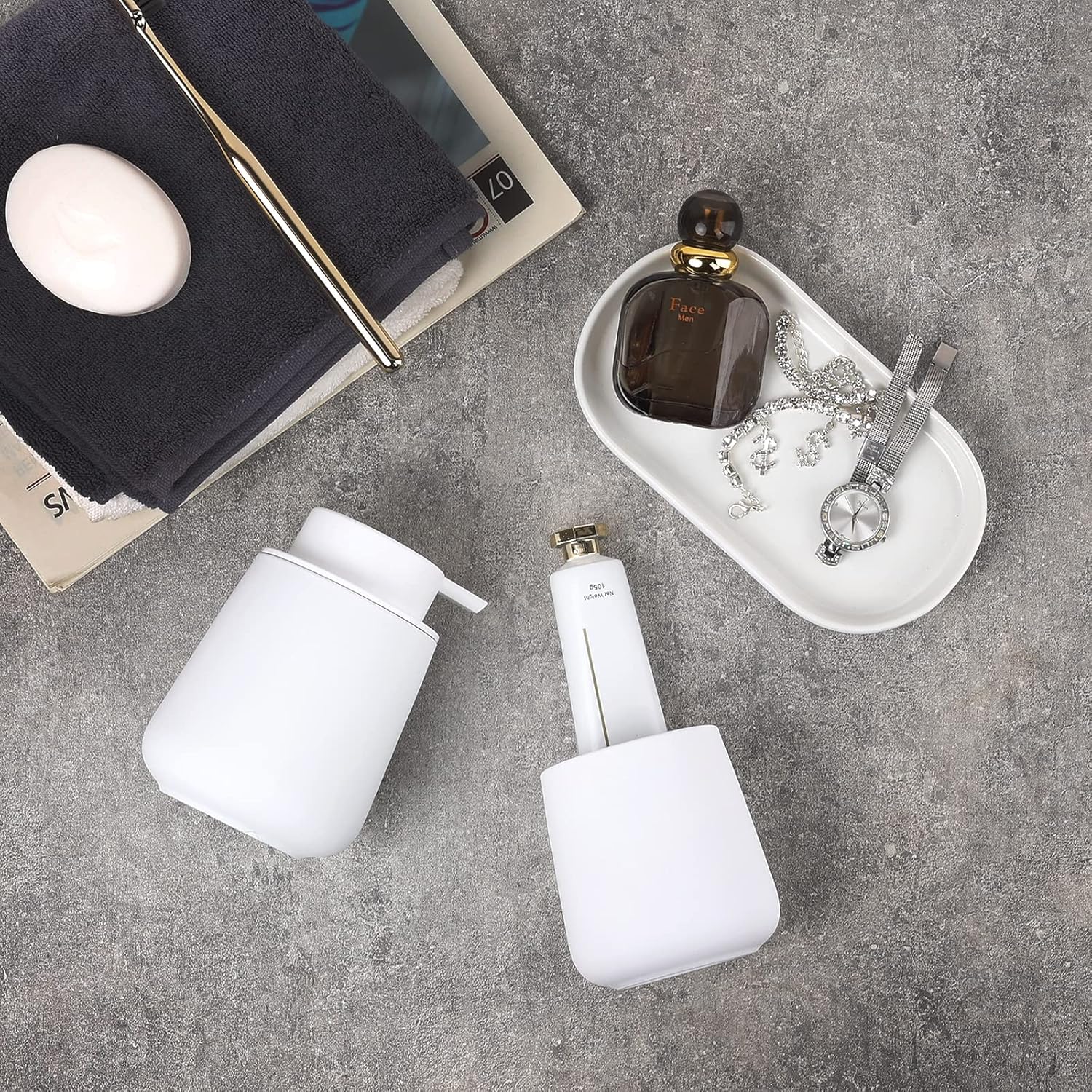 - Bathroom Sets Accessories: 3 pieces bathroom accessory set includes a soap dispenser pump, a toothbrush holder, 1 tray. Perfect for storing your toiletries and keep your bathroom counter fully organized neatly