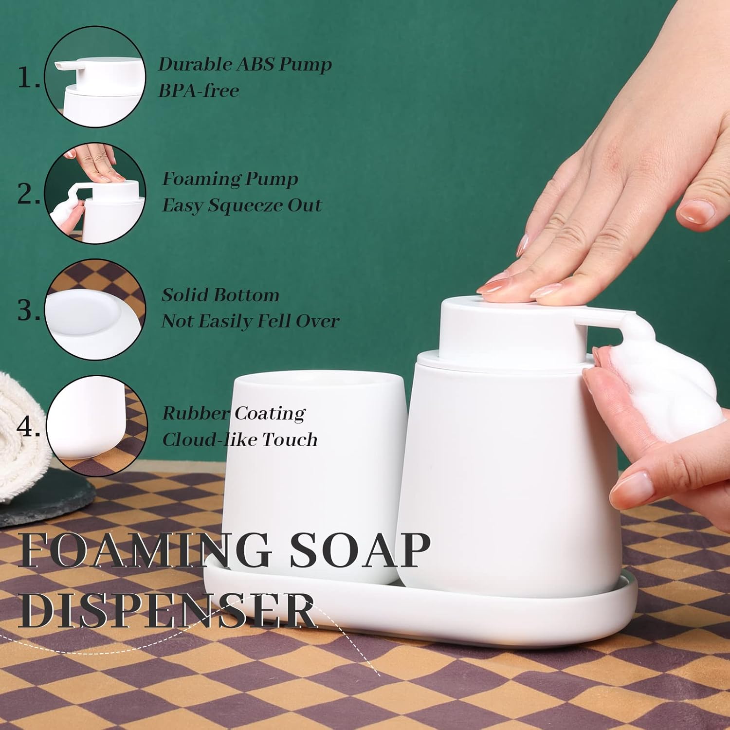 BosilunLife Bathroom Accessories Set 3 pcs - Bathroom Ceramic Foaming Soap Dispenser Set Farmhouse White Bathroom Decor, Foam Soap Dispenser and Toothbrush Holder/Tumbler Cup, Tray