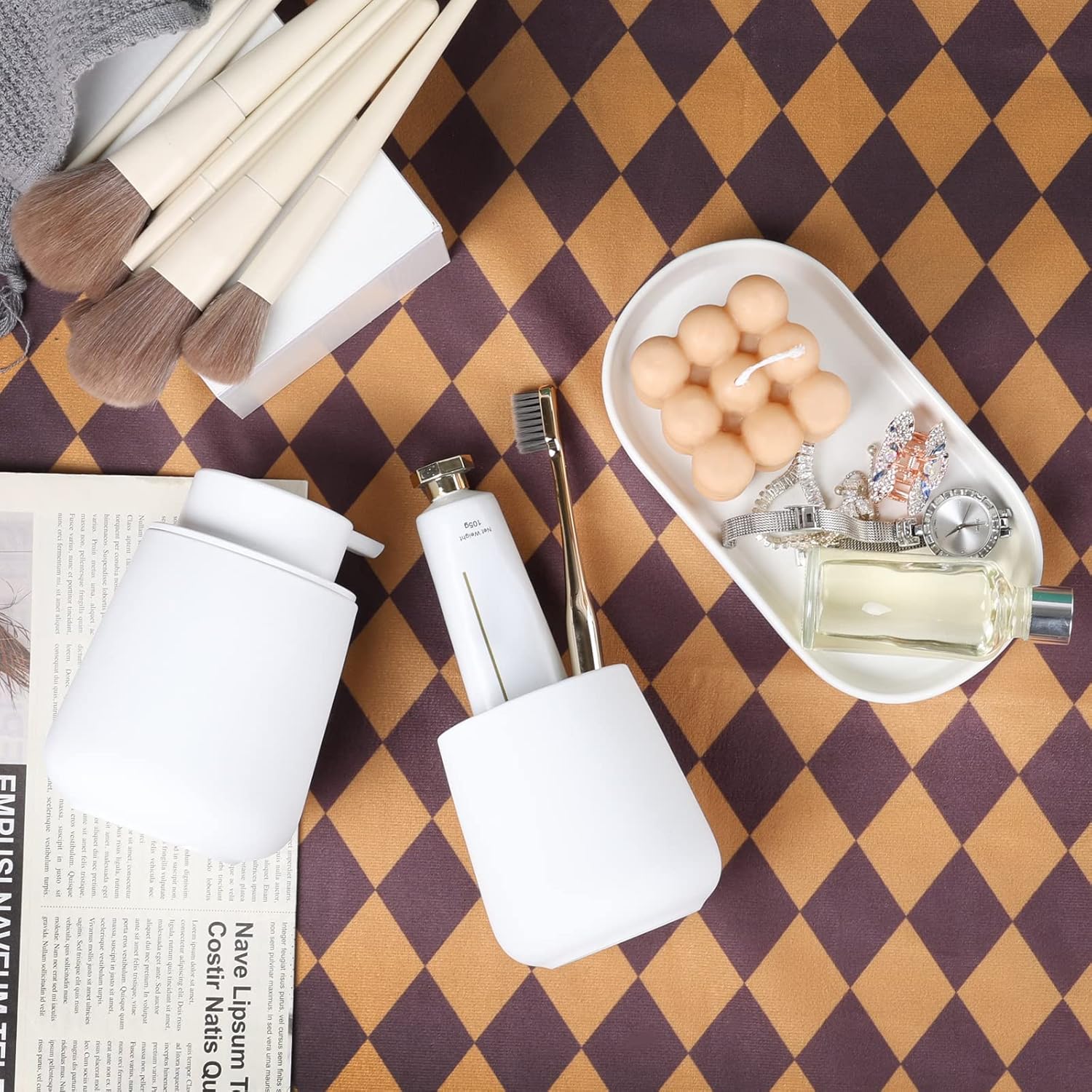 - Bathroom Sets Accessories: 3 pieces bathroom accessory set includes a soap dispenser pump, a toothbrush holder, 1 tray. Perfect for storing your toiletries and keep your bathroom counter fully organized neatly