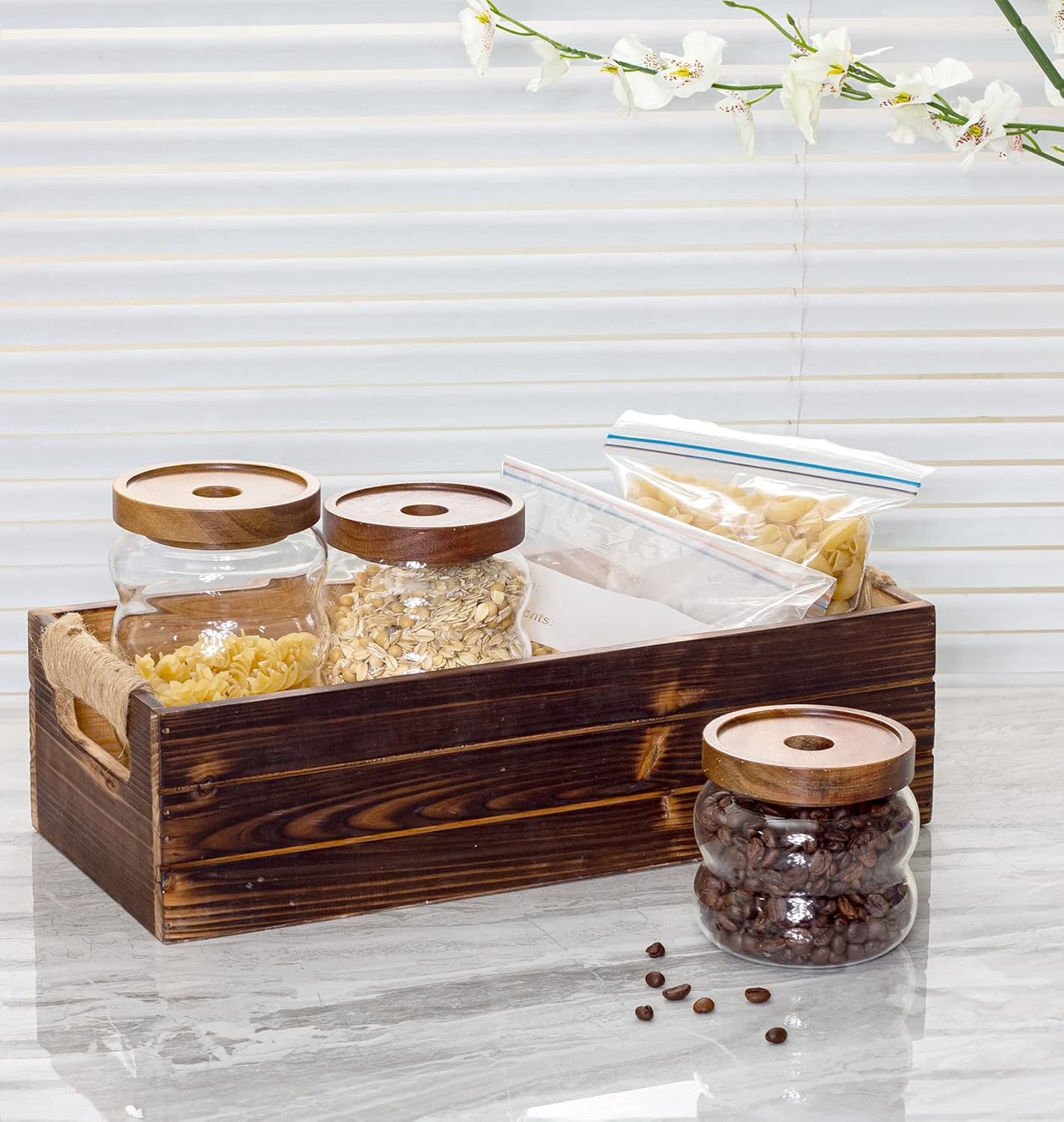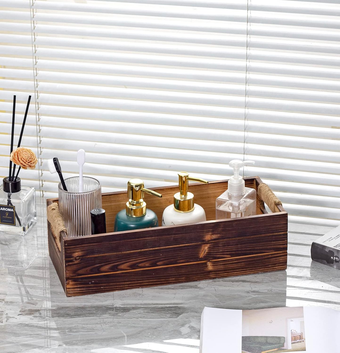 - UNIQUE DESIGN – The rectangular wooden container has natural wood grain and knots on the surface, so each box is unique. The farmhouse jute rope cutout handles make the box a vintage look that allow you to carry it around with ease.