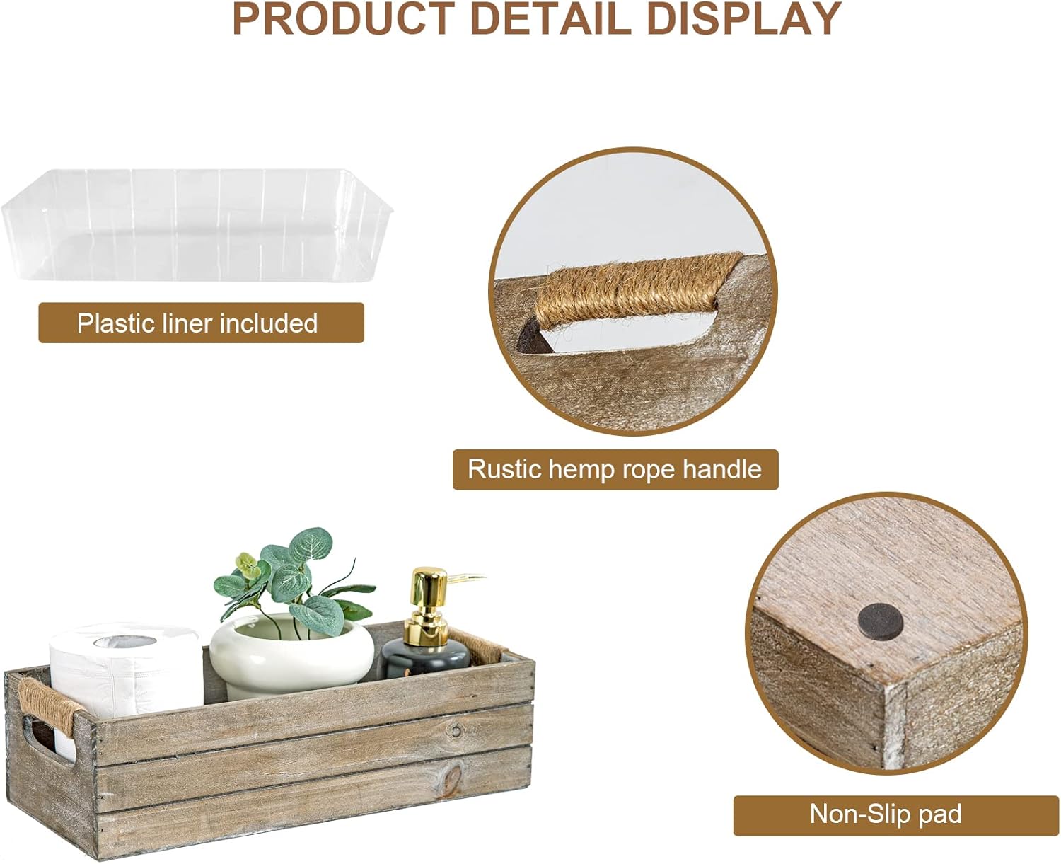 - SUPERIOR QUALITY – Our farmhouse decorative box is made of 100% natural solid wood, which is sturdy and durable, the structure is strong and stable for long-term use. It comes with a removable plastic clear liner for easy cleaning and water resistant. The bottom has 4 non-slip pads to prevent scratches the countertop. The size of the wooden box is 14”L x 6.3”W x 3.9”H