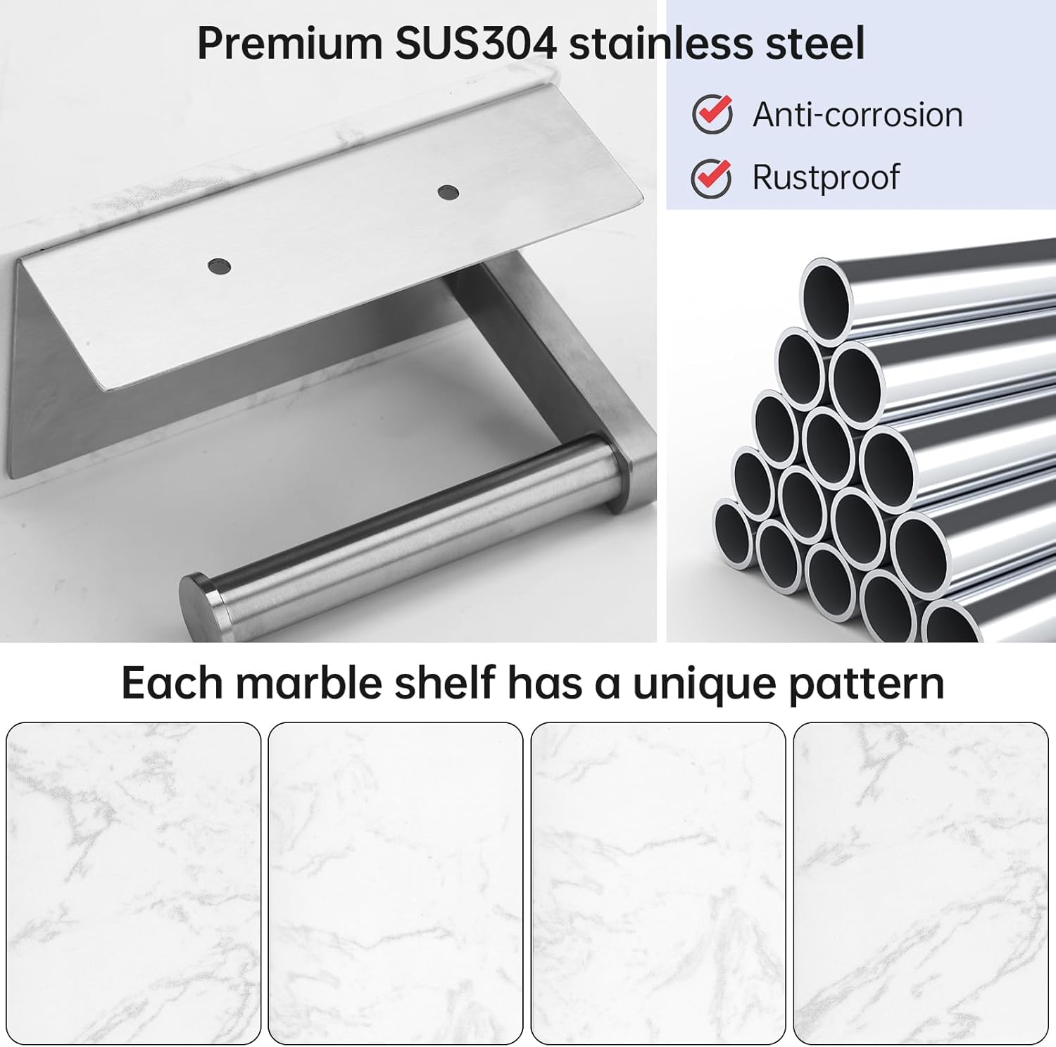 Toilet Paper Holder with Marble Shelf, SUS304 Stainless Steel Wall Mounted Toilet Paper Holder and 2 PCS Free Adhesive Hooks for Bathroom Washroom