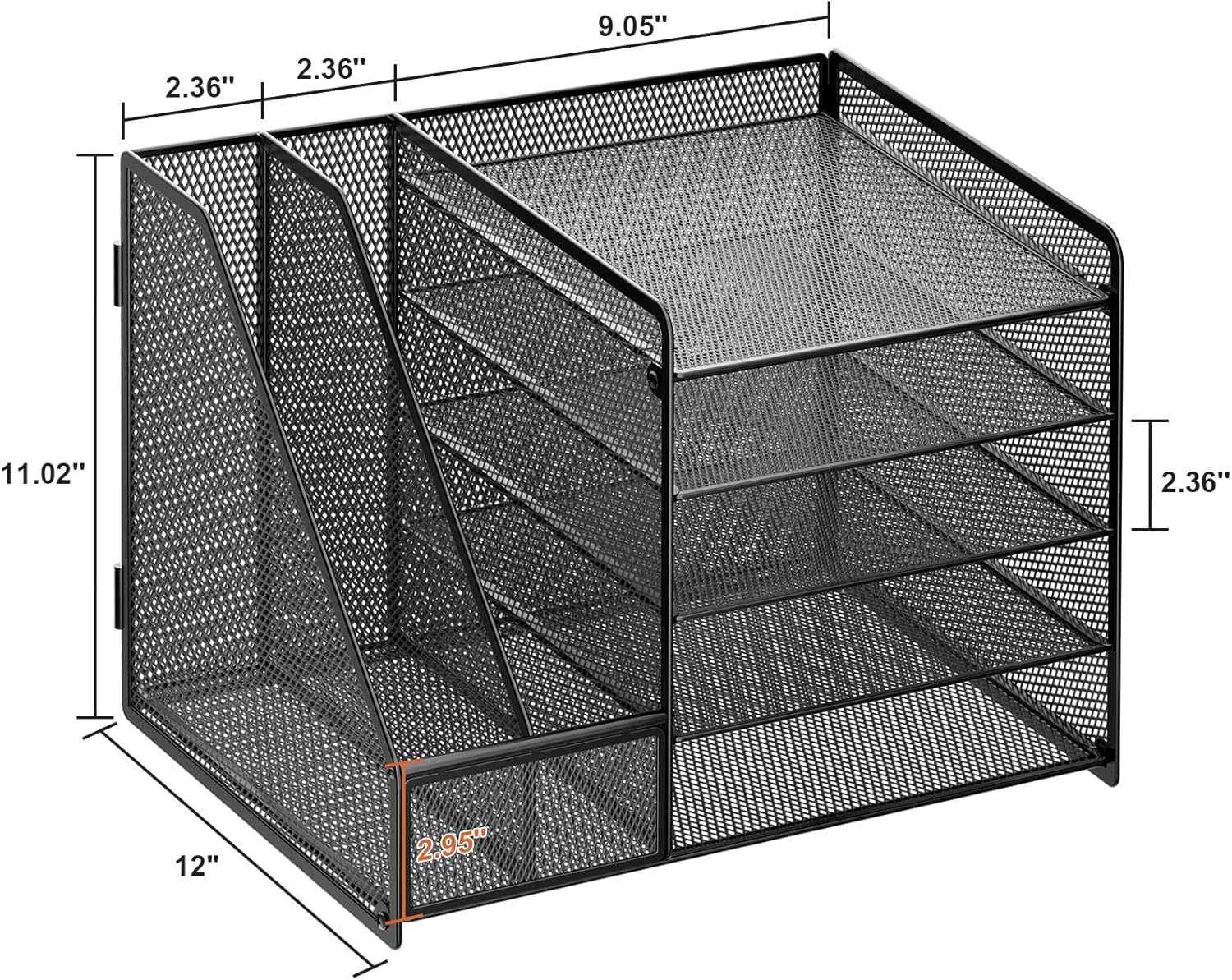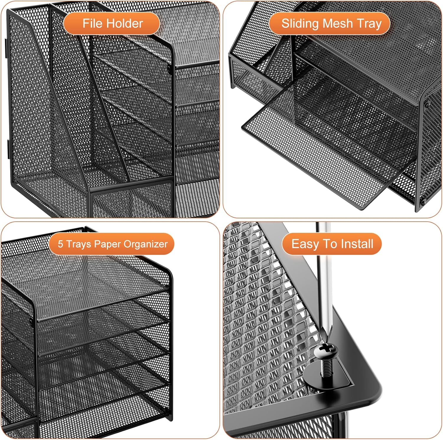Marbrasse Desk Organizer with File Holder, 5-Tier Paper Letter Tray Organizer, Mesh Desk Organizers and Accessories with Magazine Holder, Desktop Storage for Office Supplies (Black)