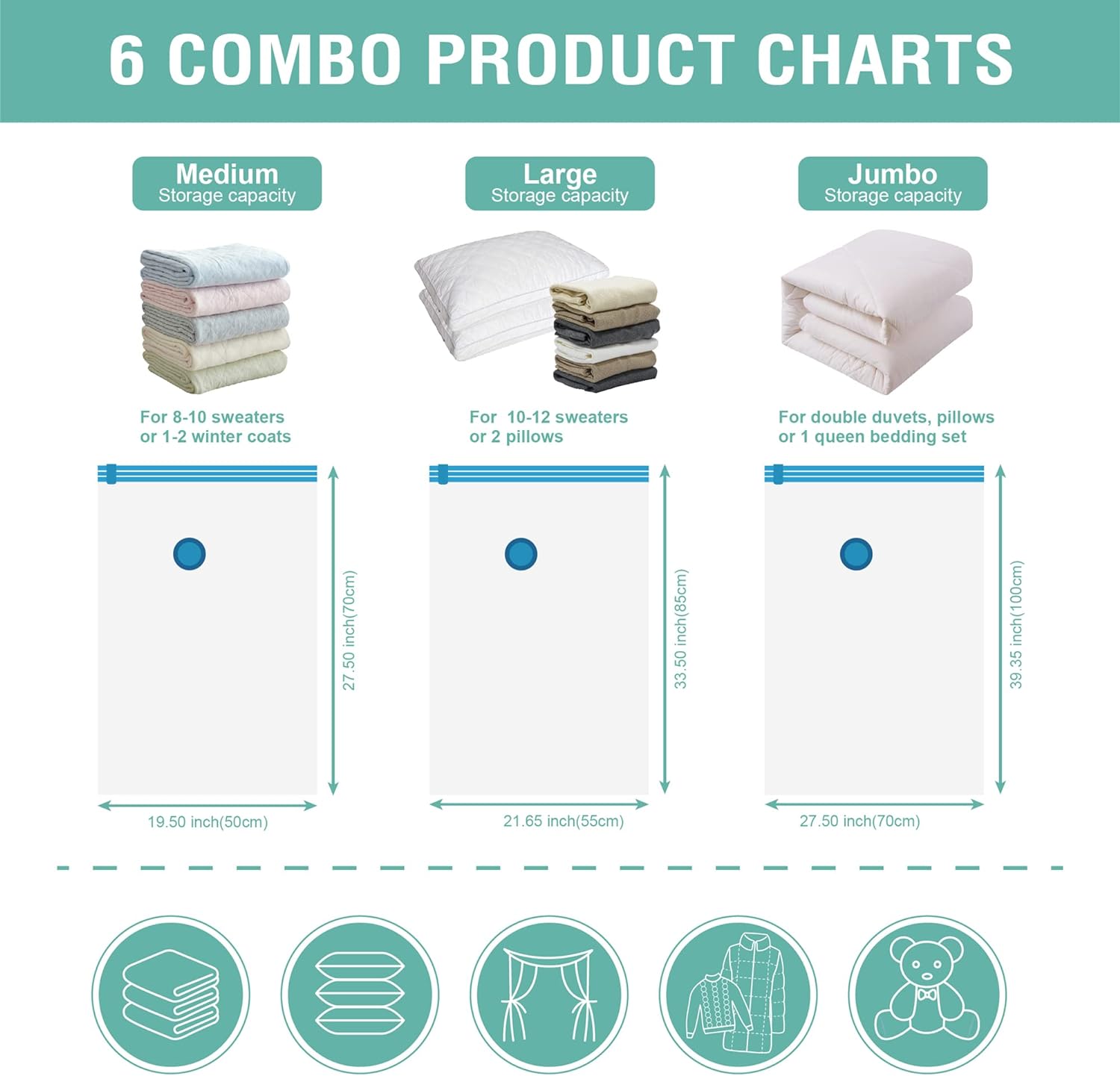 6 Pack Vacuum Storage Bags, Space Saver Bags (2 Jumbo/2 Large/2 Medium) Compression Storage Bags for Comforters and Blankets, Vacuum Sealer Bags for Clothes Storage, Hand Pump Included