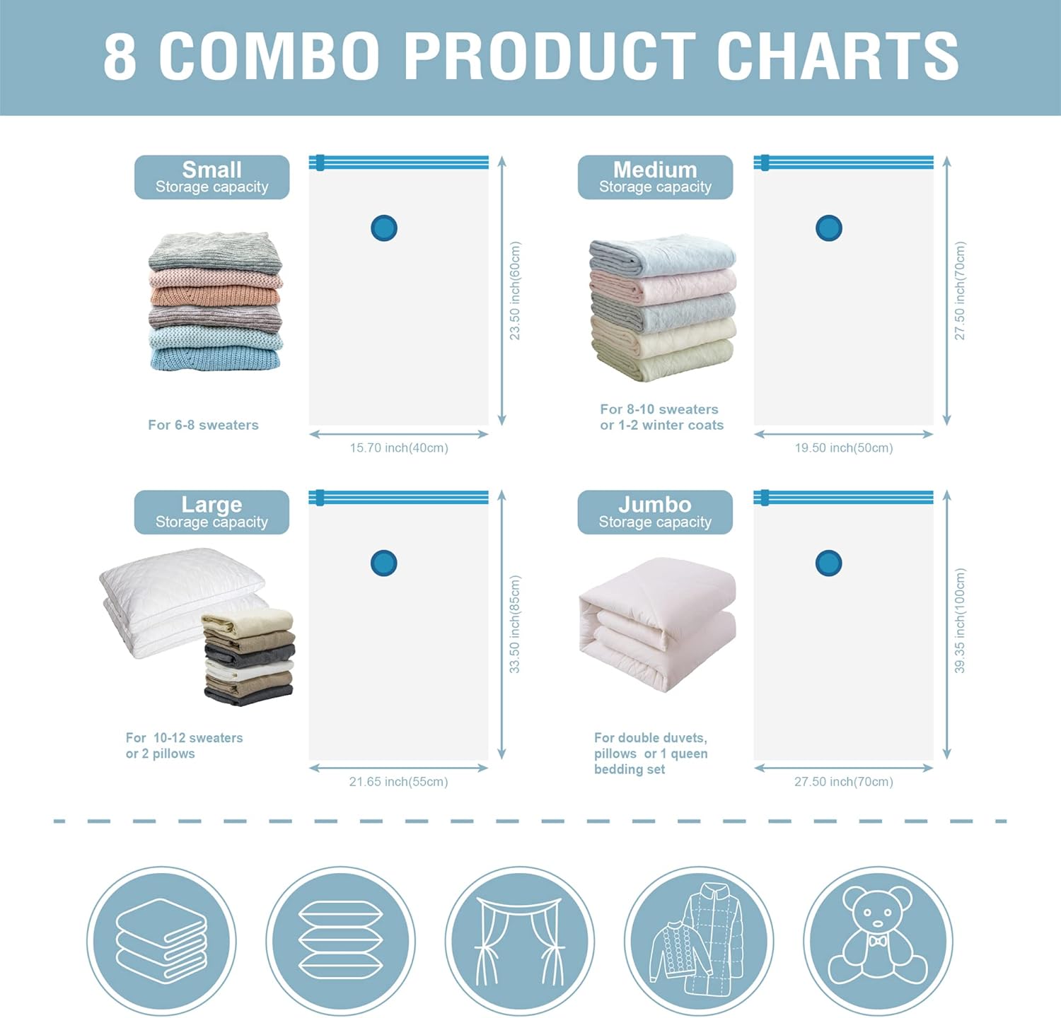 8 Pack Vacuum Storage Bags, Space Saver Bags (2 Jumbo/2 Large/2 Medium/2 Small) Compression Storage Bags for Comforters and Blankets, Vacuum Sealer Bags for Clothes Storage, Hand Pump Included