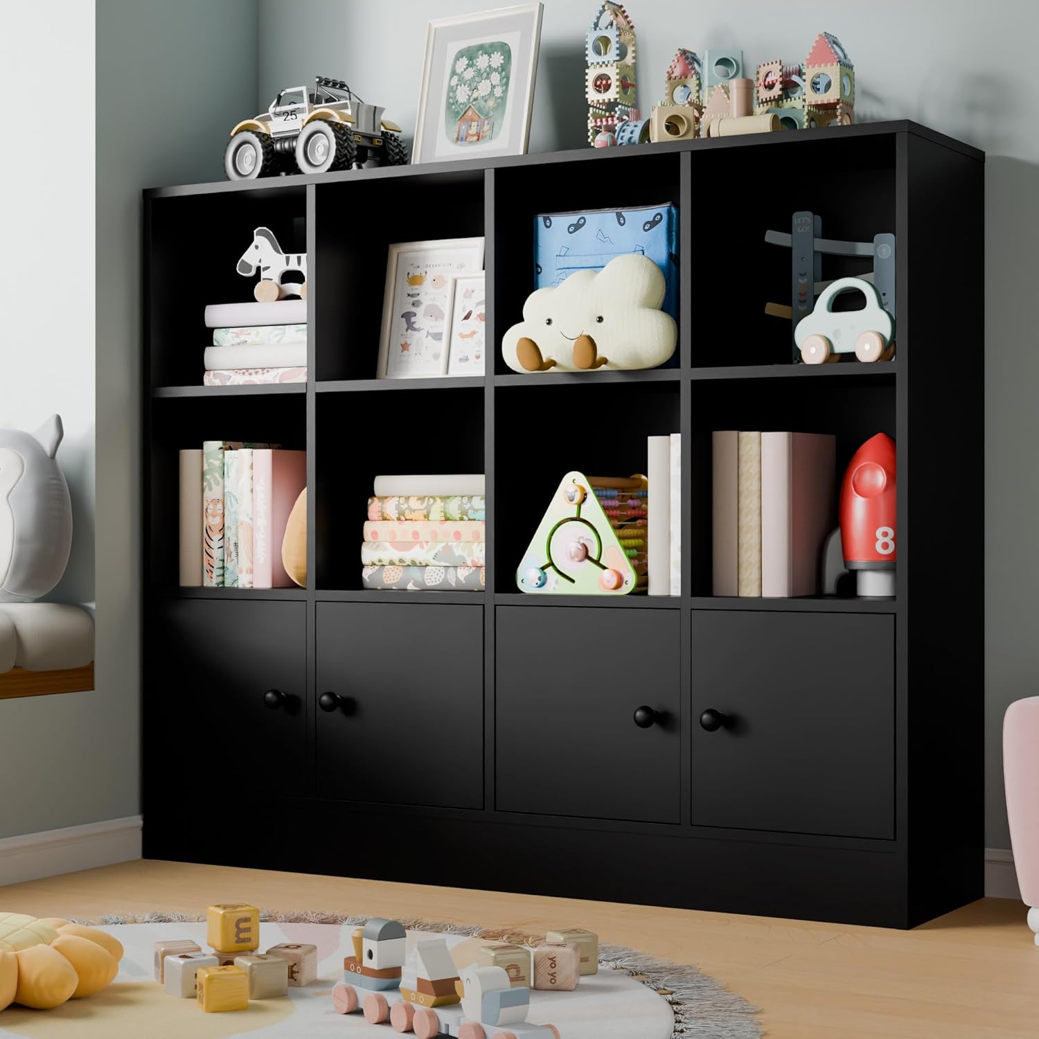 - Large Storage Capacity: Cozy Castle Cube Storage Organizer has 8 open storage shelves and 4 door storage cabinets. Use it to store toys, books, or extra items. This cube shelf offers plenty of storage space for your belongings and is the perfect height for your child