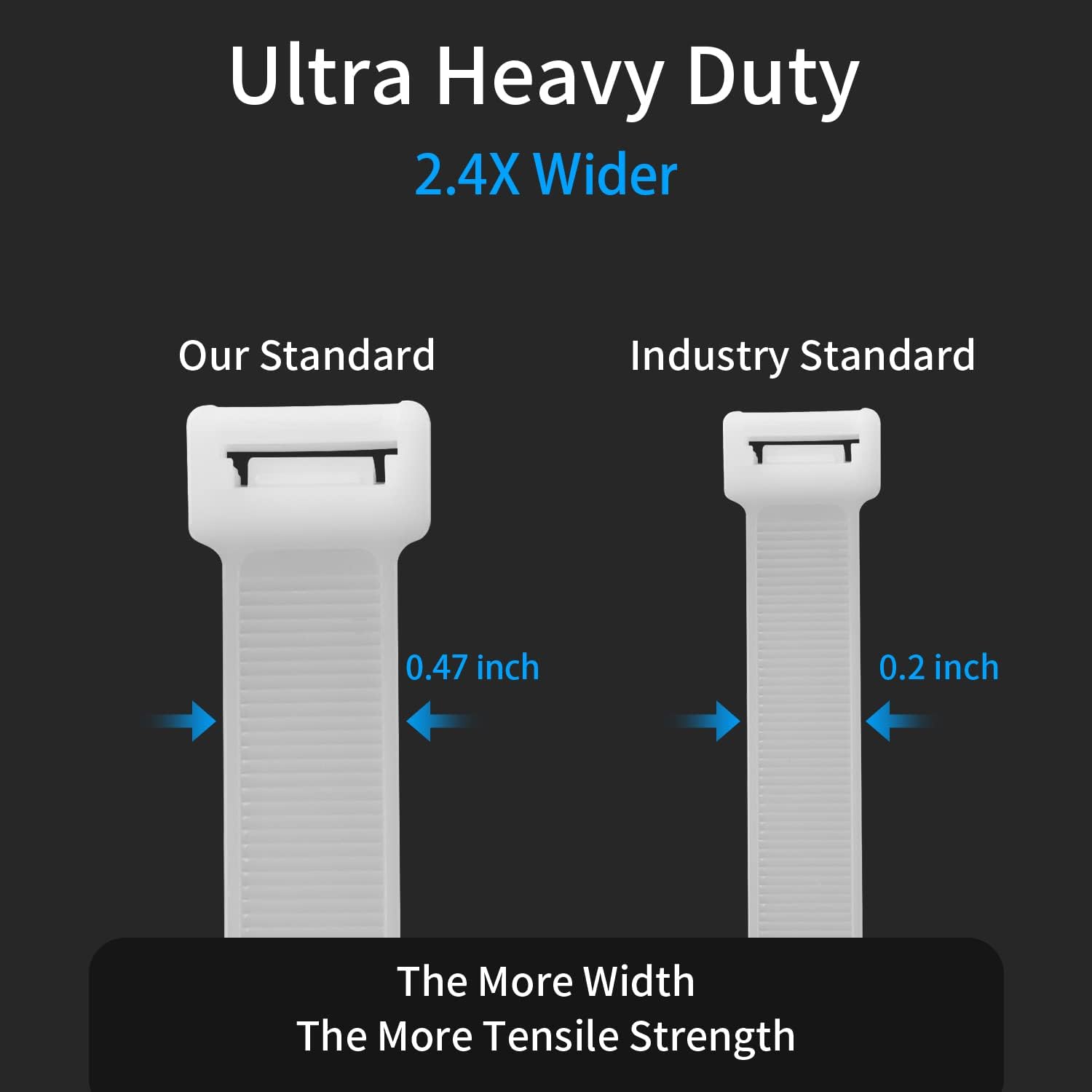 - 【Ultra Strong Heavy-Duty Zip Ties】Extra Large Wide Cable Zip Ties Heavy Duty for outdoor use, Width 12mm with 12 inch /300mm long. 250 LBS Ultra Strong Tensile Strength. Wider, Thicker, More durable for use!
