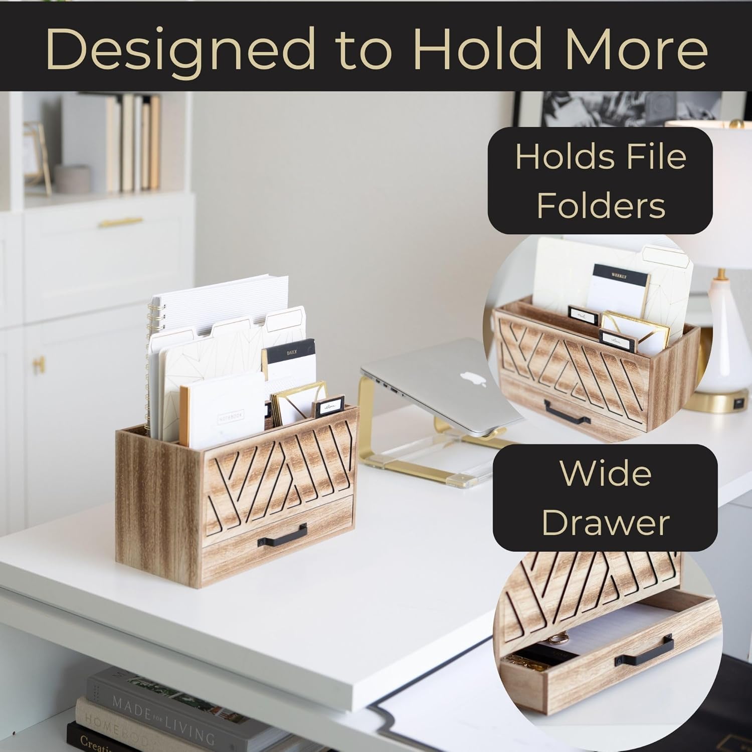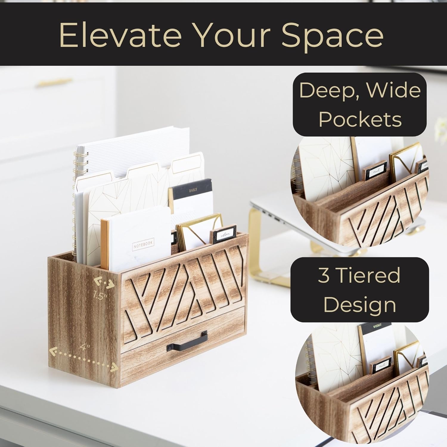 BLU MONACO Natural Wood Desktop Mail Organizer – Three-Tiered with Gold Label Holders and Drawer – Stylish Mail Holder and Countertop Document Storage for Home or Office