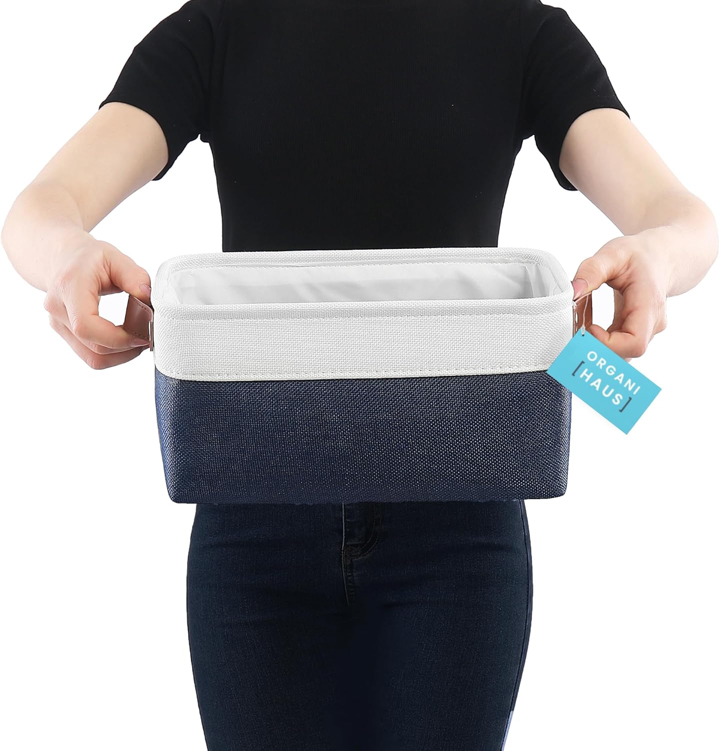 OrganiHaus Small Fabric Storage Baskets for Shelves 3 Pack, 12x08in Closet Storage Bins for Shelves, Canvas Baskets for Organizing, Linen Closet Organizers, Cloth Basket, Navy Blue/Off-White