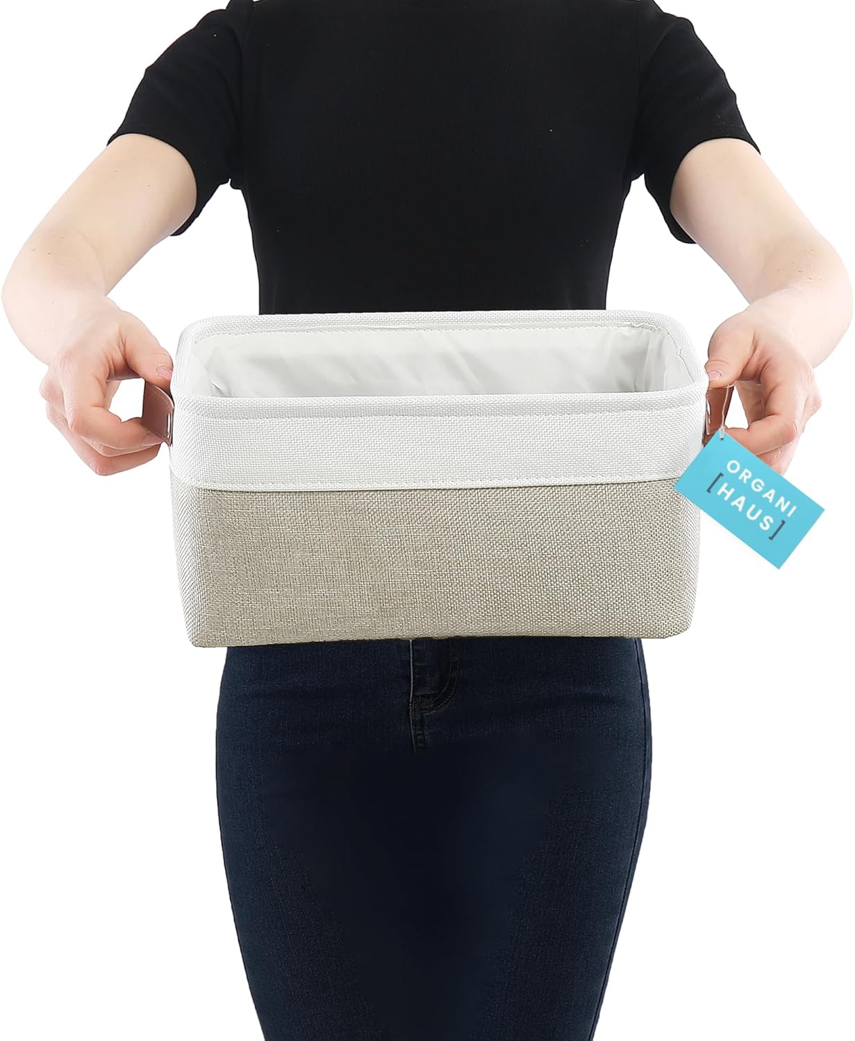 OrganiHaus Small Fabric Storage Baskets for Shelves 3 Pack, 12x08in Closet Storage Bins for Shelves, Canvas Baskets for Organizing, Linen Closet Organizers, Cloth Basket, Beige/Off-White