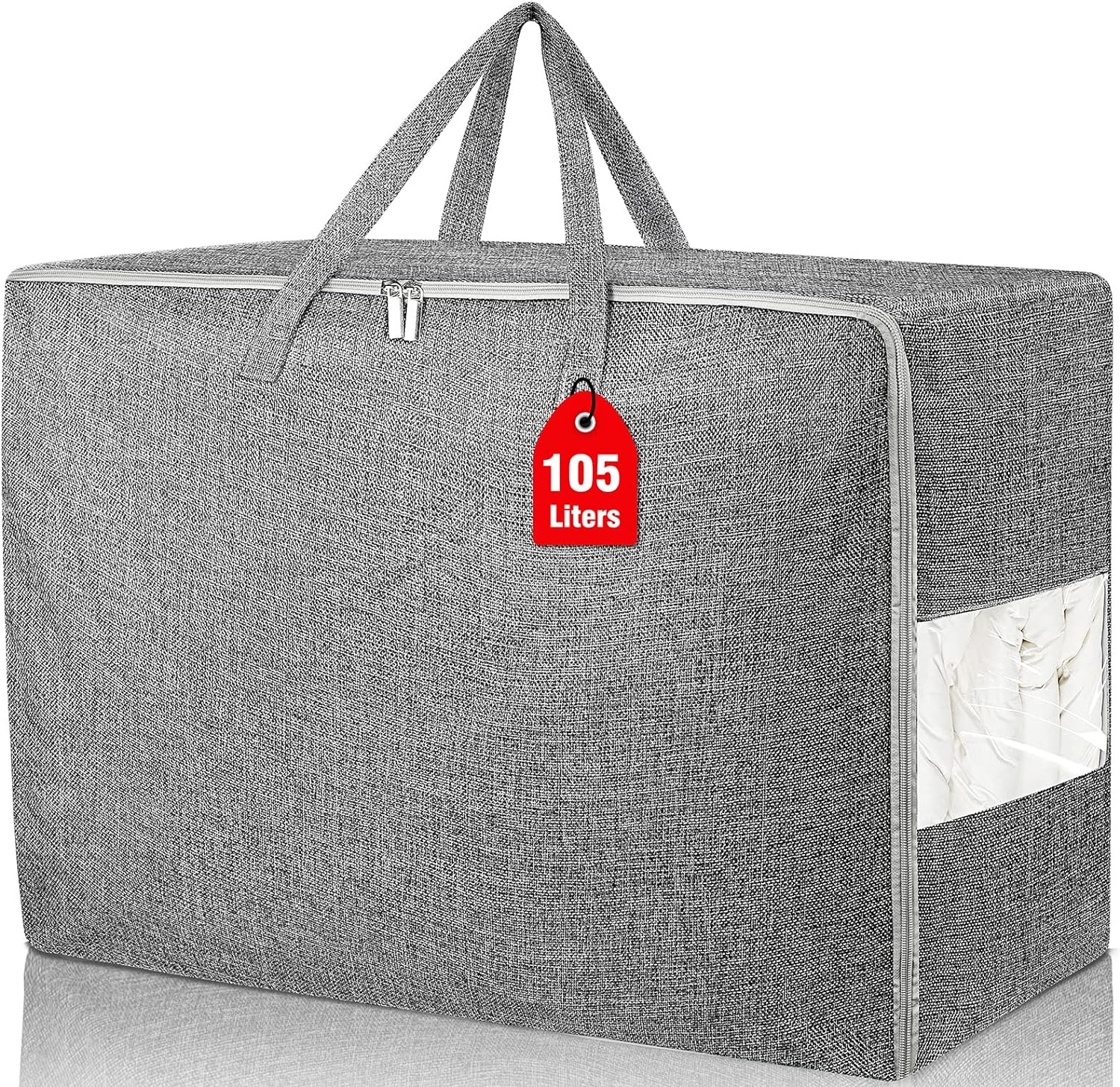 105L Extra Large Storage Bags, Folding Moving Comforter Blanket Storage Bags Closet Organizers and Storage Containers for Clothes with Strong Handles&Zippers Clear Window for Bedding Pillow, Grey