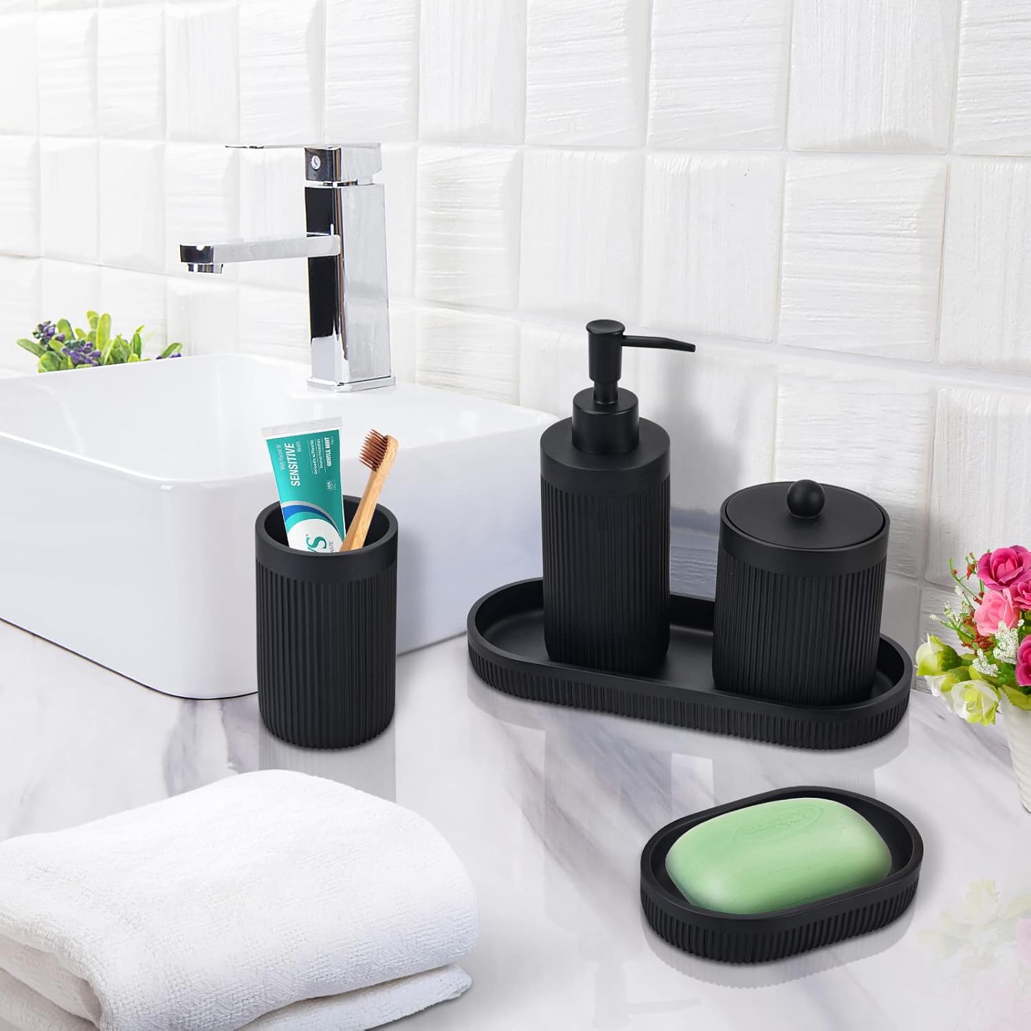 Bathroom Accessory Set 5Pcs-Lotion Soap Dispenser,Toothbrush Holder,Qtip Holder Dispenser,Vanity Tray and Soap Dish-Modern Bathroom Decor Vanity Countertop Organizer,Matte Black