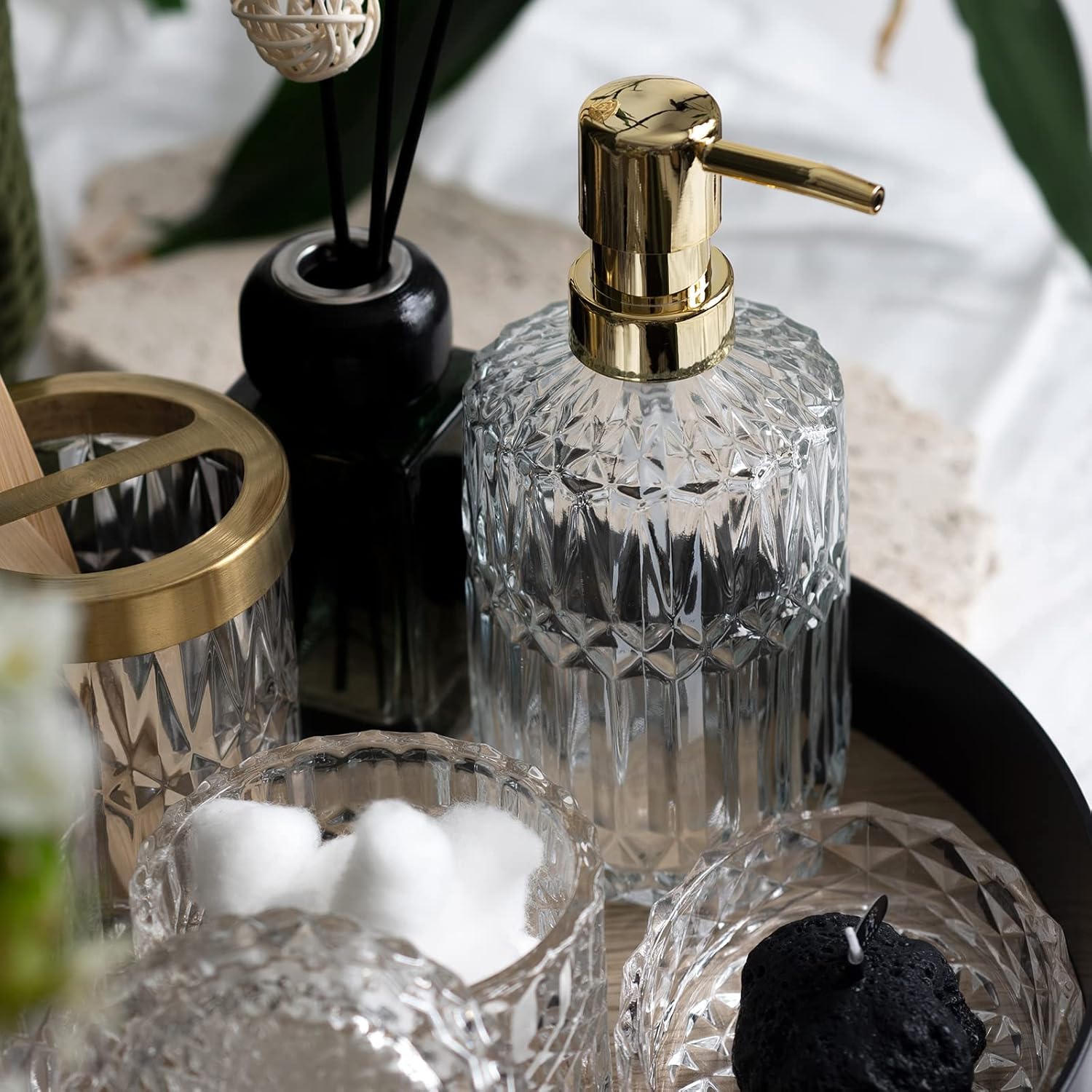 - 【Premium Heavy Glass Construction】Crafted from lead-free thick glass with sophisticated craftsmanship, featuring diamond-cut patterns that create elegant light reflections. The durable SS dispenser pump and stainless steel components ensure long-lasting performance in humid environments.