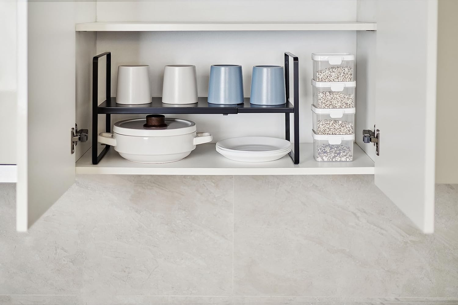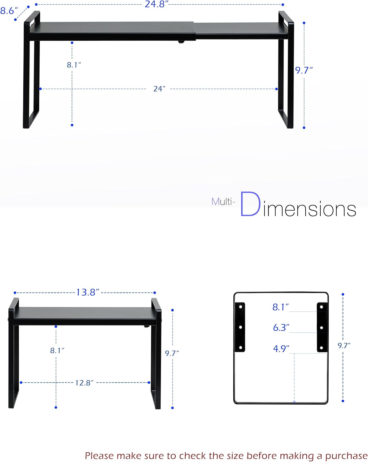 Nxconsu Cabinet Shelf Expandable Height Adjustable Organizer Riser for Kitchen Cabinet Pantry Cupboard Under Sink Countertop Organization Storage Space Saver Stackable Heavy Duty Metal Black
