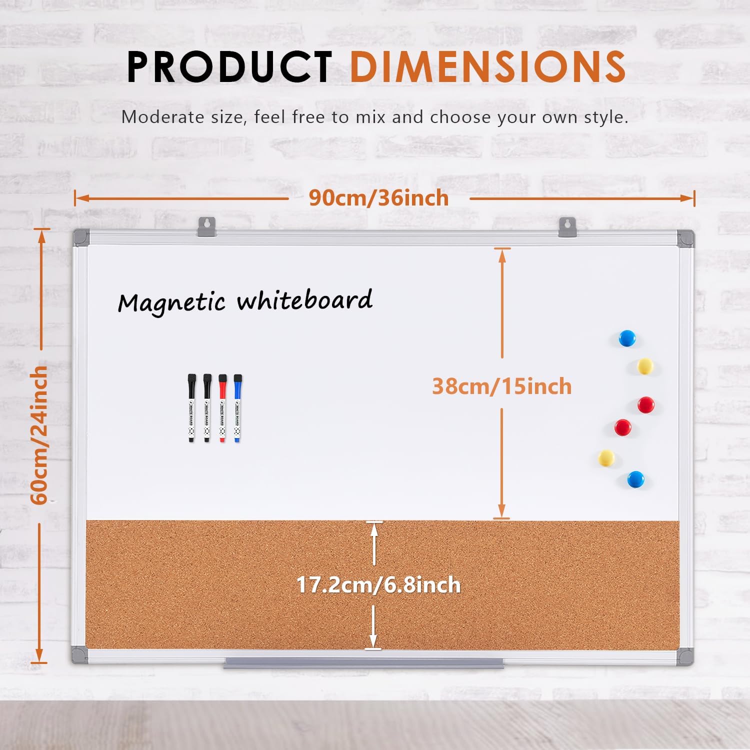 - 🔔Dimensions-Overall—36" L x 0.5" W x 24" H;Corkboard - 33.6" L x 6.8" H;Whiteboard - 33.6" L x 15" H.