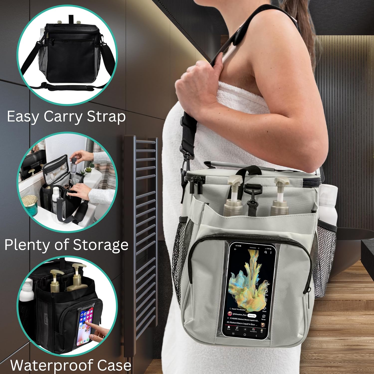 - NEWLY DESIGNED: ADDED FEATURES | Our XL hanging shower caddy with extra storage is newly designed with added features to enhance your experience. It's large enough to fit all of your toiletries yet compact enough for traveling. The portable shower caddy comes with a shoulder strap, keychain holder, extra storage, and a waterproof phone compartment