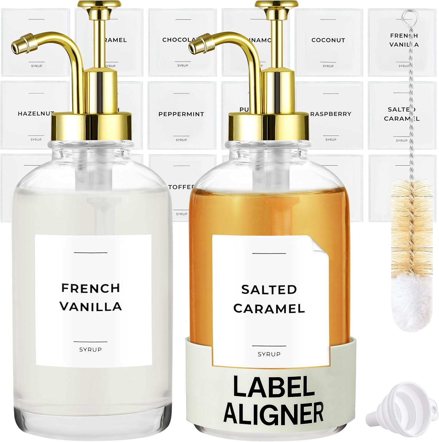 - All-in-One Value Pack for Coffee Lovers — This set of 2 glass syrup bottles includes 24 waterproof syrup labels, a cleaning brush, and a silicone funnel for effortless refills. Perfect for keeping multiple flavored syrups organized, it’s a cost-effective upgrade to your coffee station.