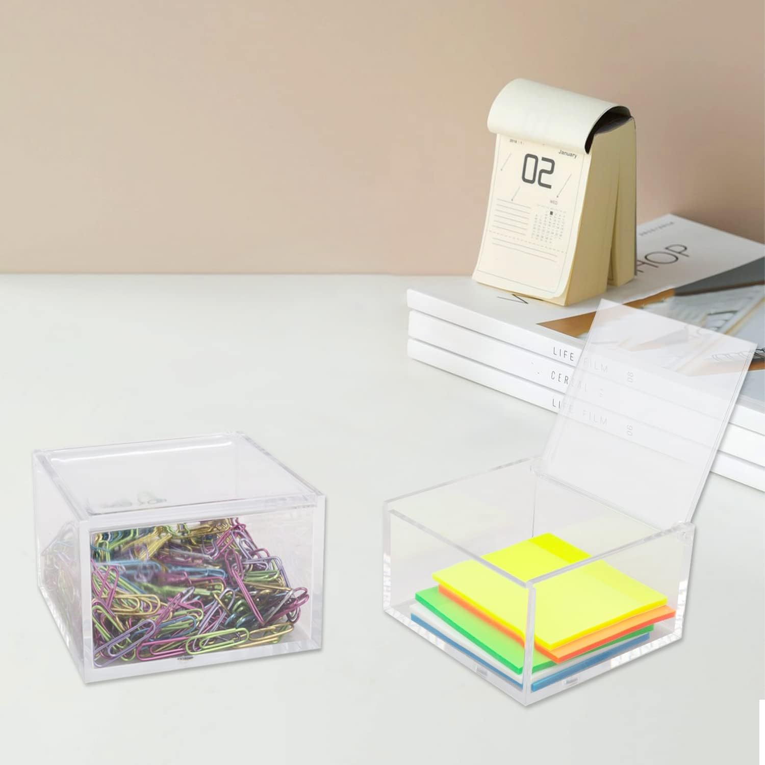 2 Pack Clear Acrylic Organizer with Lid for Paper Clips,Sticky Note,Qtip,Cotton Balls,Hair Ties Holder Acrylic Box for Home Office Bathroom Desk Organizer