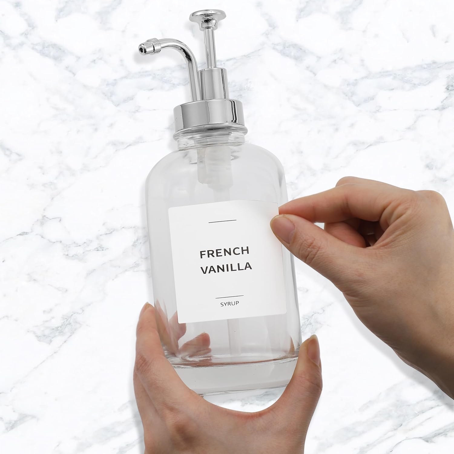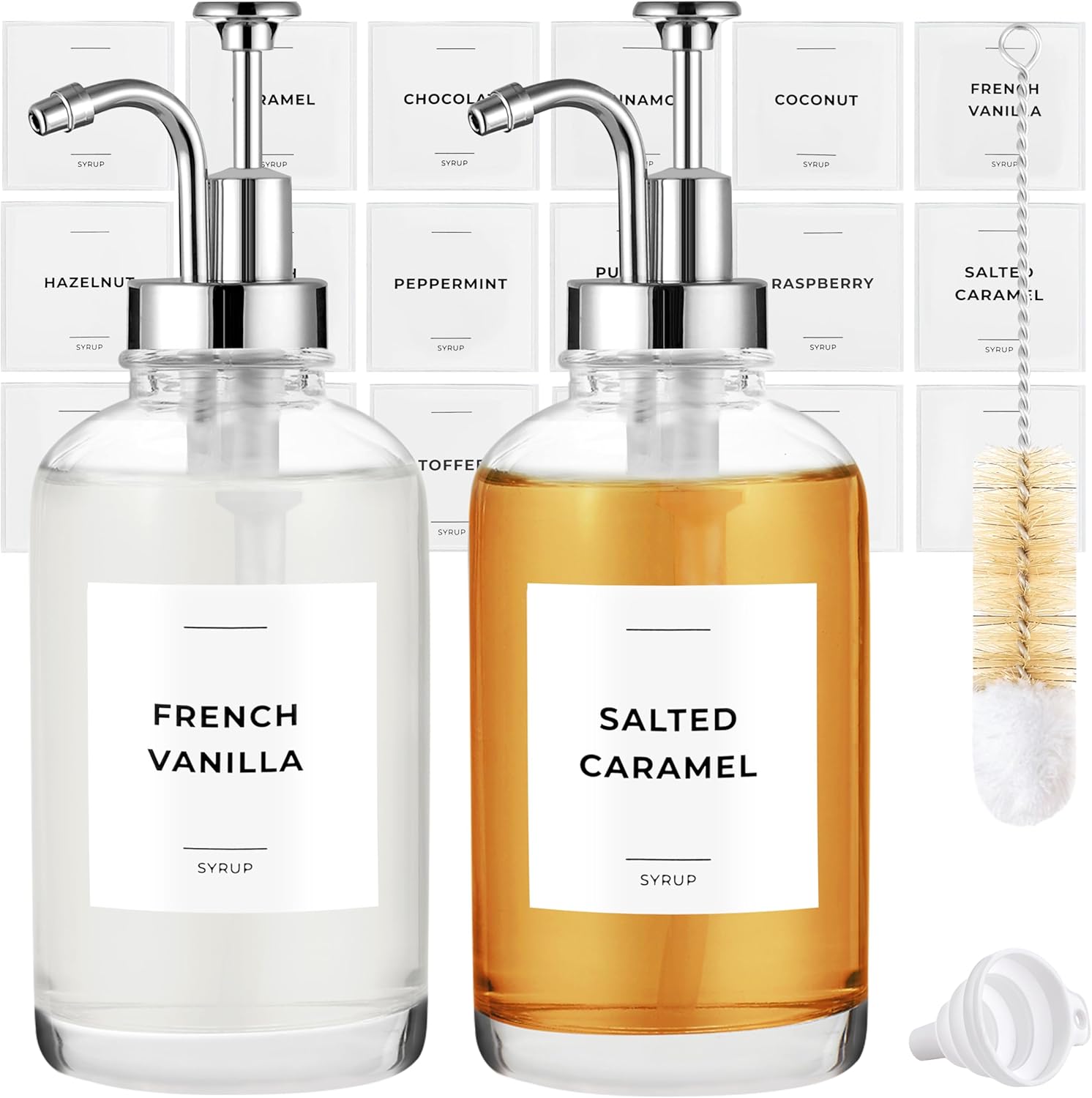 - All-in-One Value Pack for Coffee Lovers — This set of 2 glass syrup bottles includes 24 waterproof syrup labels, a cleaning brush, and a silicone funnel for effortless refills. Perfect for keeping multiple flavored syrups organized, it’s a cost-effective upgrade to your coffee station.