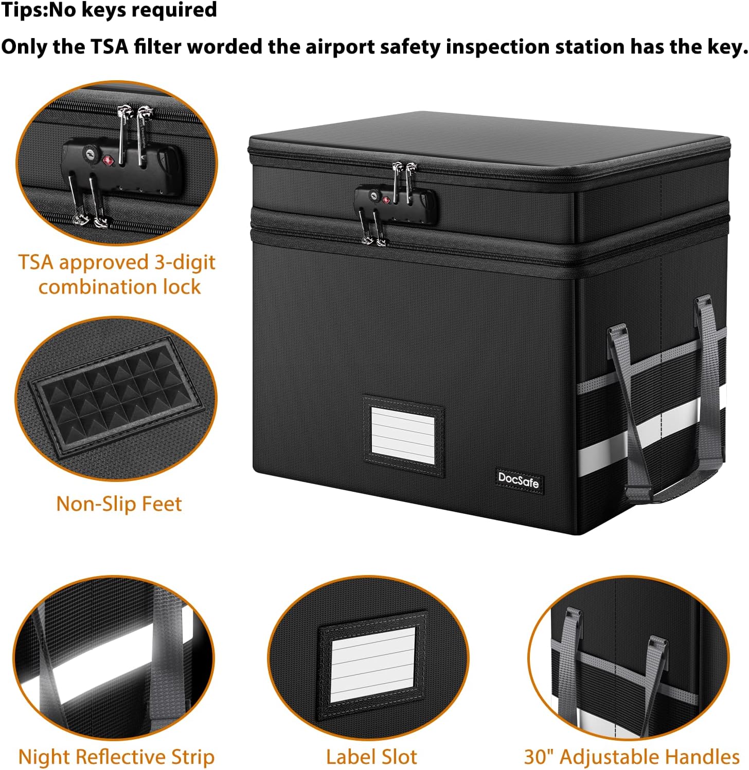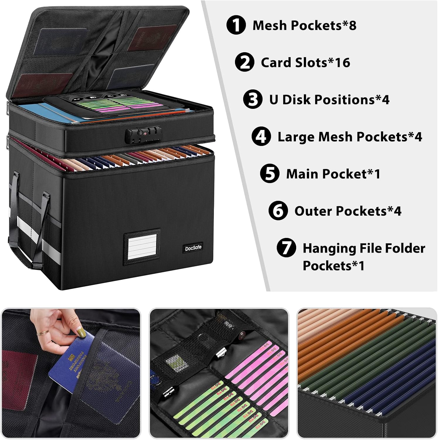 DocSafe File Box with Lock,Multi-Layer Fireproof Document Box Collapsible File Storage Organizer with Pockets/Handle,Large Portable Home Office Filing Safe for Hanging Letter/Legal Size Folders,Black