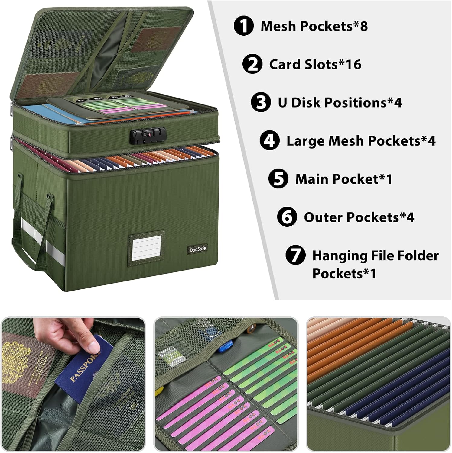 - Multi-Layer&Large-capacity(16"x13.8"x12.2"): Compared with other file boxes, our fireproof file box adopts a multi-layer design that can meet all your storage needs. These include 8 passport mesh bags, 16 card slots, 4 U disk pockets, 2 mesh bags, 4 outer pockets, 1 large pocket, and one main pocket with large space. They are ideal for storing cards, passports, CDs, USB, albums,certificates and other valuables.The main pocket can fit both letter and legal-size files or anything else you want.