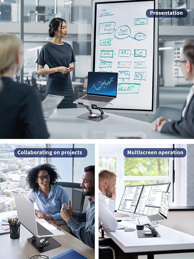 - Collaborate with Ease: The SOUNDANCE laptop stand features a 360° rotatable base, making it easy to share your computer screen with others while collaborating on projects.