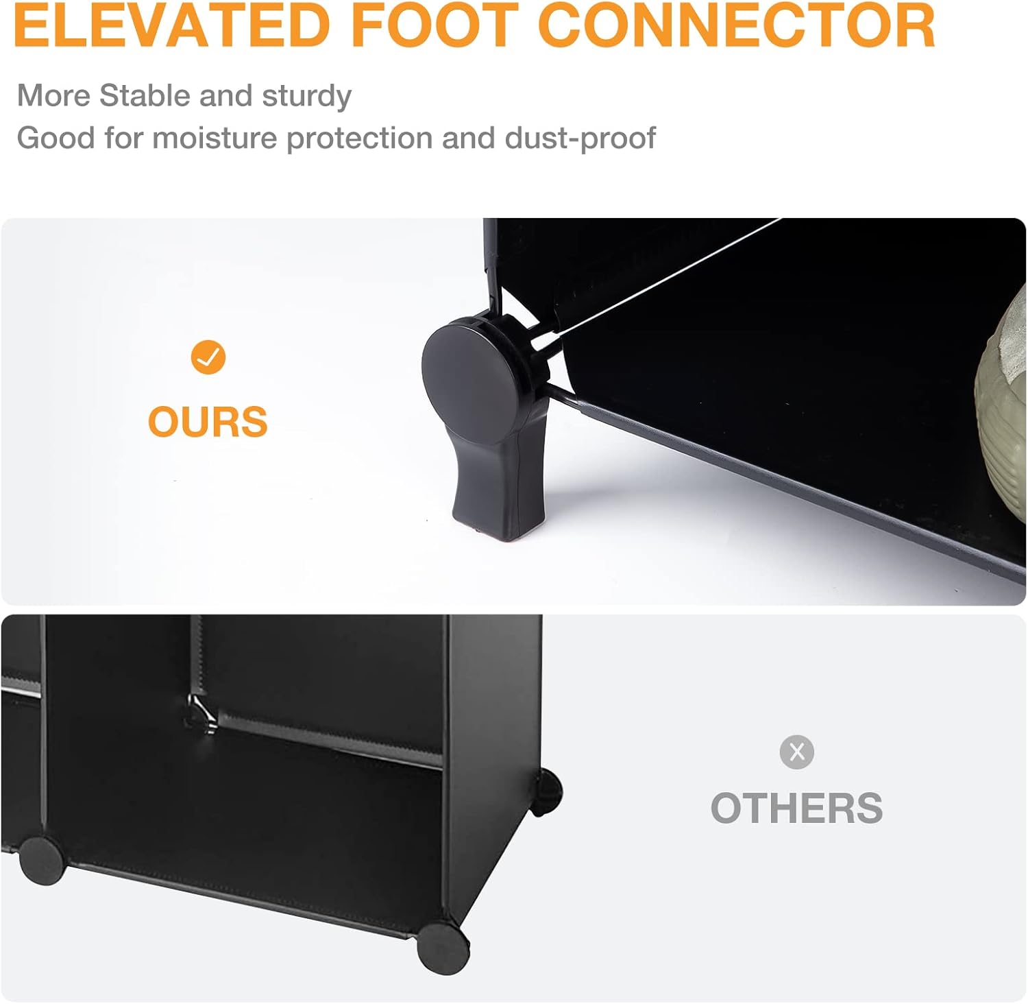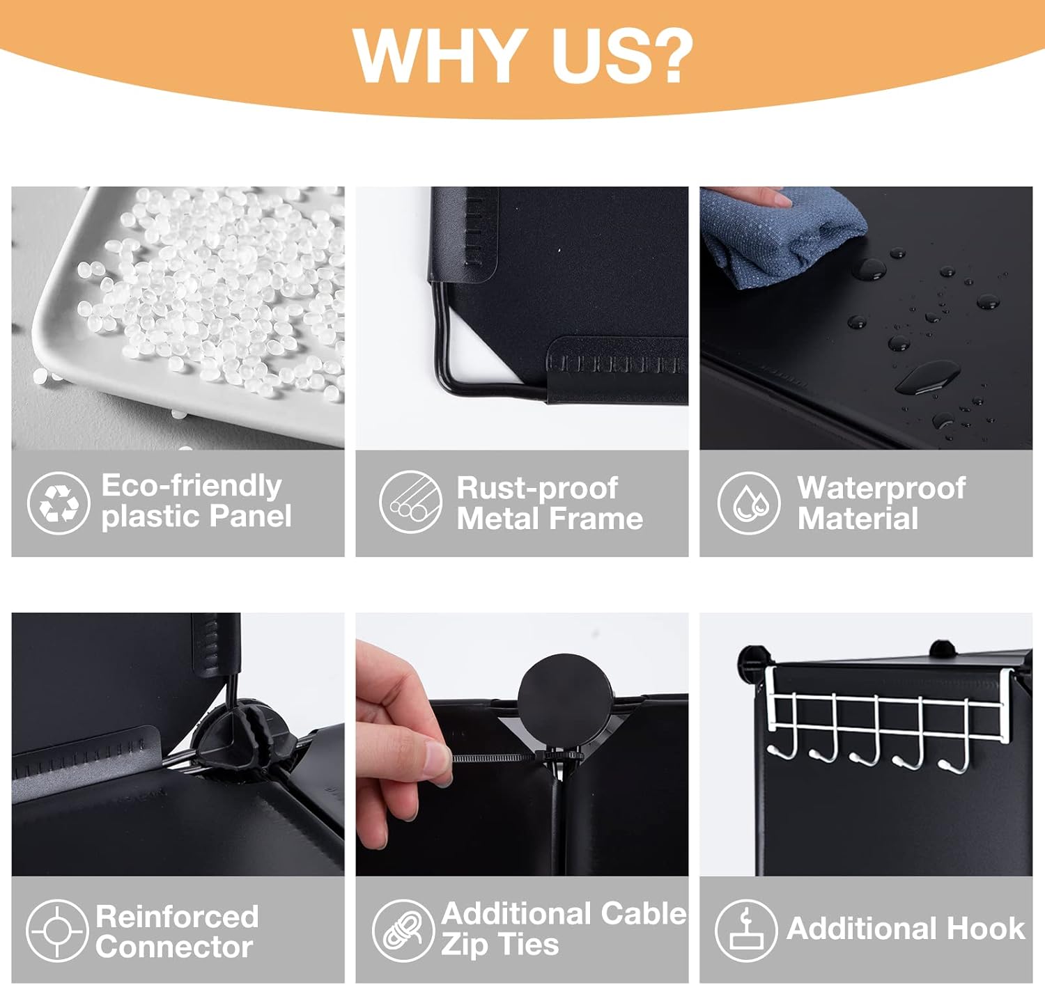 - 【Stable Structure】The storage shelves each size is 11.8" x 11.8" x 11.8" (30 x 30 x 30cm), consisting of thickened polyethylene plastic sheet, sturdy metal frame and high quality ABS resin connectors.Please note: it fits storage bin that is smaller than 11.5*11.5 inches. Each cube of the wardrobe clothes organizer holds up to 22 lb. This is a very stable structure that won’t tip or fall over .