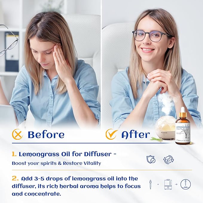 - Body Massage: Mix 2-3 drops of lemon grass oil essential oil with 10 to 20 drops of carrier oil (sweet almond, grapeseed or jojoba). Take an appropriate amount of the oil blend into your palm and apply it in circular motions on the parts of the body that need to be massaged to relax the body and mind, relieving pain in overworked or tired muscles